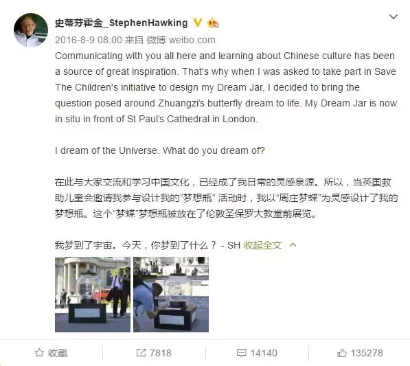 史蒂芬·霍金的一生注定是不平凡的一生,不仅因为他的科研贡献,还有他对于生命的渴望和尊重。他失去了运动的能力,但他还有坚强的意志;他失去了说话的能力,但他还有学习的追求;他失去了自理的能力,但他还有严谨的逻辑能力。3月14日,他走了,但他与宇宙重逢了......