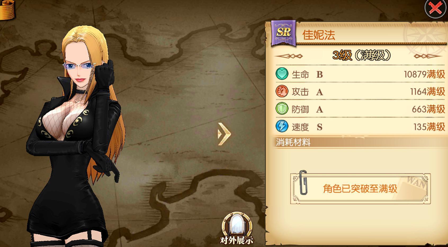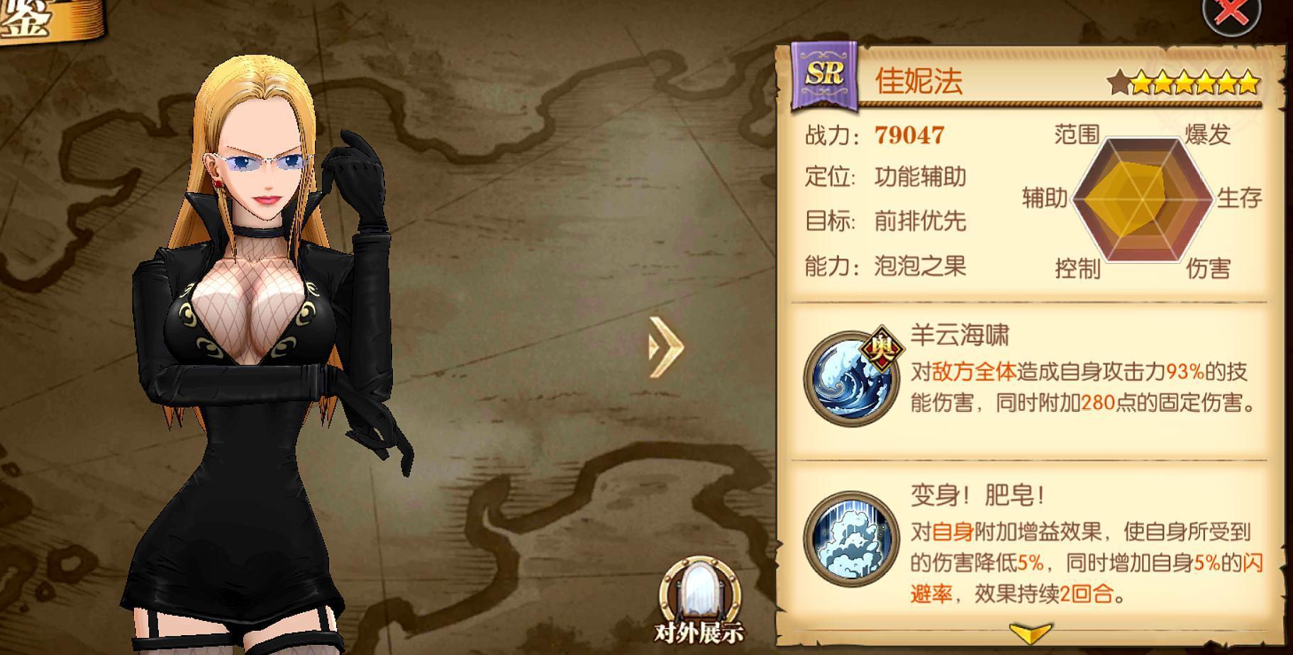 目前最好用的辅助之一,也是少有能够登上PVP舞台的SR角色,不过现在也被迫退出了。但其过剧情的效果,却是实打实的强劲,大概在司法岛剧情,有了佳妮法通关概率要大很多。另一个通关利器是罗宾,不过最新的剧情,罗宾也有点吃力了。