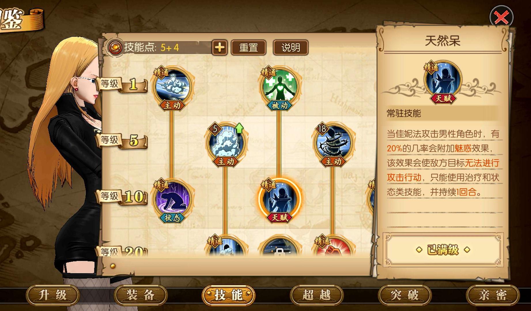 天然呆点满。这个必须点满,过剧情的神技,被魅惑的目标只能普通,无法释放技能,在过追击的卡普那一关有奇效。