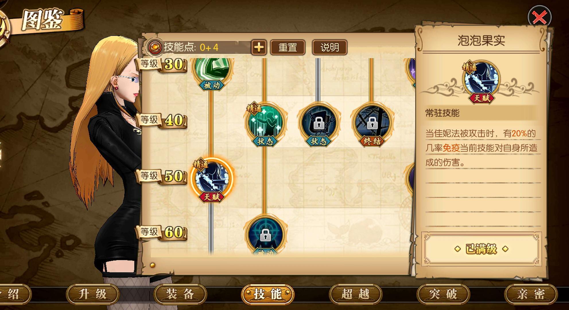 泡泡果实点满。佳妮法最有效果的自保技能,也是佳妮法能够上阵的关键技能。被攻击的时候,有概率直接免疫本次的攻击效果。