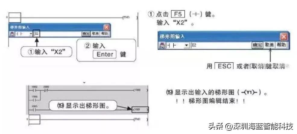 使用功能键或工具按钮编辑梯形图,功能键和梯形图符号关系显示在工具栏的按钮上,编辑梯形图时,必须先设置在“写入模式” 。