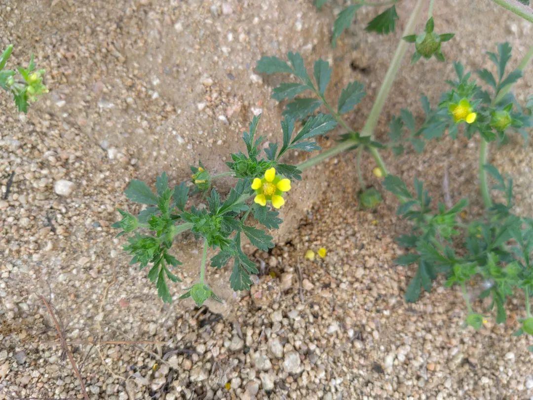 农村田野、路边绿化带有这样一种植物,叶子乍看有点儿像香菜,花像蛇莓,但是比蛇莓花要小很多,花开时在草丛中非常惹眼,它就是朝天委陵菜。