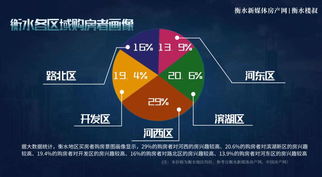 根据衡水新媒体房产网大数据统计的意图画像显示:衡水地区购房者感兴趣的区域依次为:河西区(29%)、滨湖新区(20.6%)、开发区(19.4%)、路北区(16%)、河东区(13.9%)。