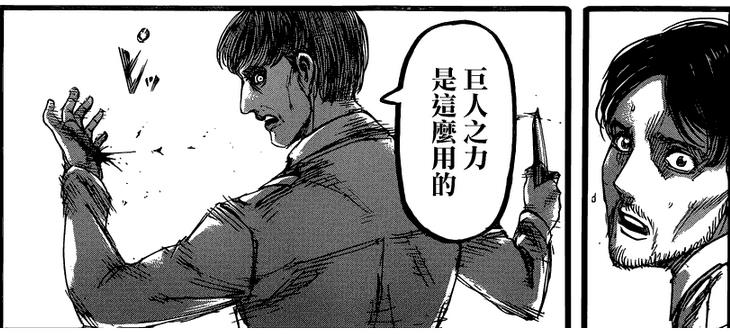 被出卖了的艾尔迪亚人经过了痛苦的审判后被送到了乐园接受惩罚,也就是变成巨人。然而,一同来执行审判的人中有格鲁吉,他就是潜伏在马莱人中的艾尔迪亚人,并且拥有进击的巨人之力。进击的巨人,就是追求自由的意思,也是漫画的名字。变身后,干掉了所有来的马莱人。