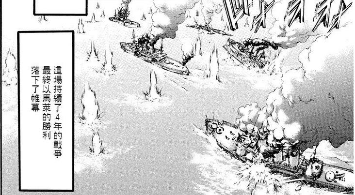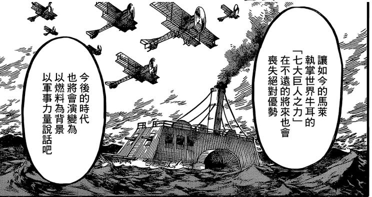 原来,马莱人想要到岛上夺取始祖巨人之力,并要获取岛上丰富的燃料资源。大陆上的文明已经相当发达了,应该是接近二战时期的水平了吧,飞机、大炮、装甲车都有。而且大炮威力很大,海军舰队齐射之后可以将铠之巨人基本干掉。
