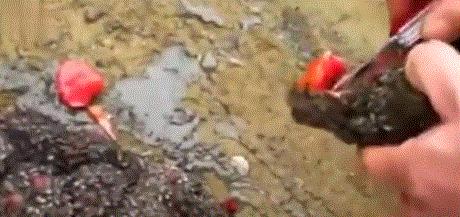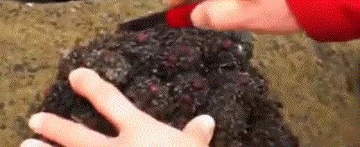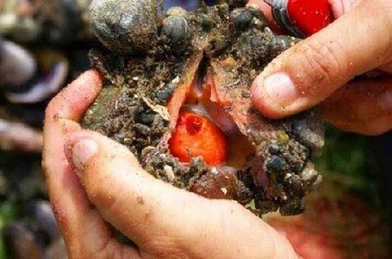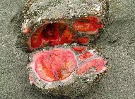 别看它外表如岩石,内里血色吓人,它可是一种美味呢!钢纤海鞘一般生长在智利和秘鲁的礁石海岸上,当地人非常喜欢的海鲜。表面被一层很厚的动物纤维素所包裹,这其实是一种安保伪装,用来抵挡周边一切的侵袭。当扒开它的时候,是一包包鲜红潮湿又多汁的坨状物。