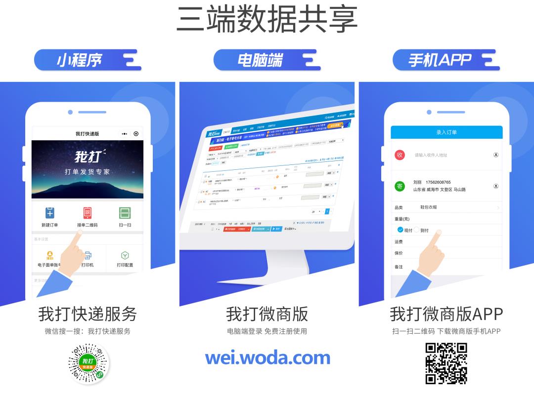 微商卖家/企业/个人亦可以使用我打微商版和小程序打单,无论电脑还是手机微信,都可以便捷录入订单,批量打印发货。