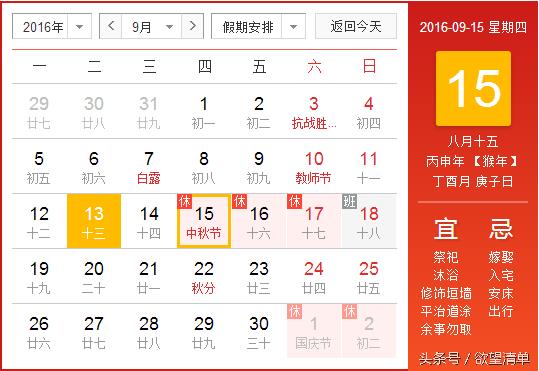 公历:2016年9月15日 星期四 农历:丙申(猴)年 八月十五