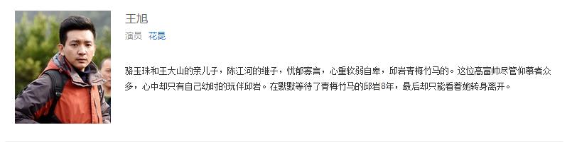 百科里对王旭的介绍说,在默默等待了青梅竹马的邱岩8年,最后却只能看着她转身离开。