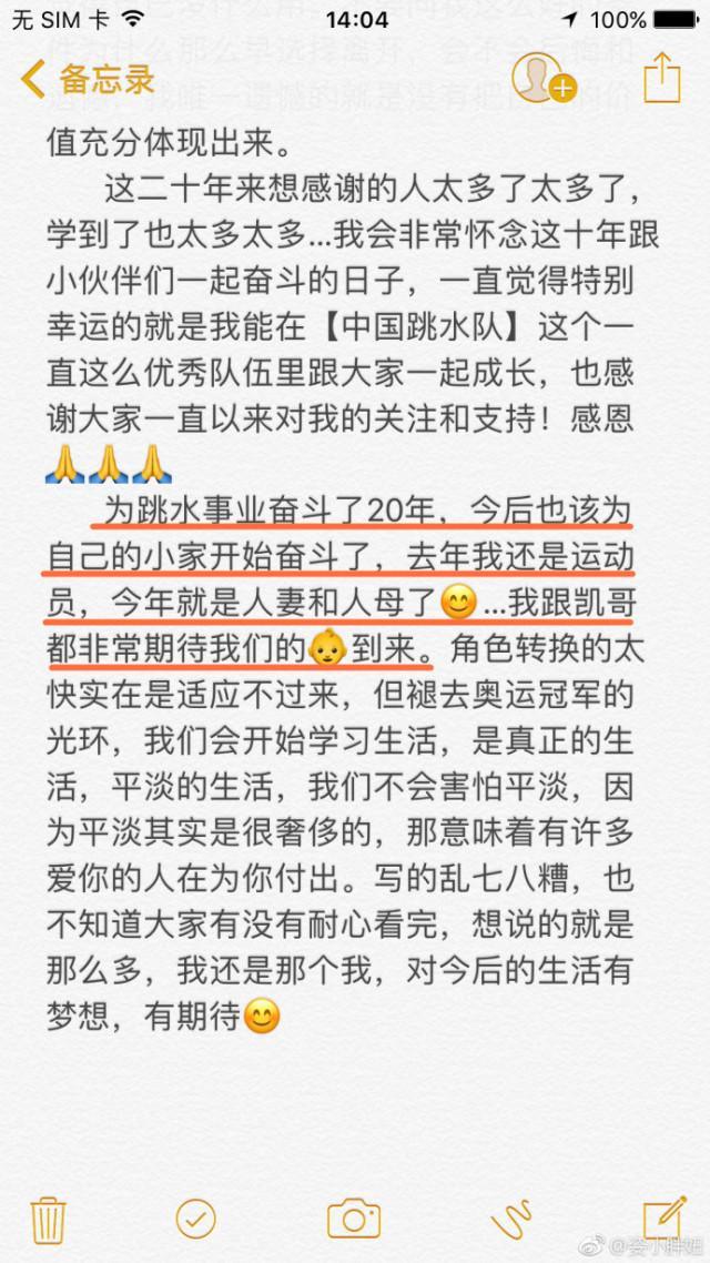 跳水冠军何姿发文喜报怀孕并宣布退役:前半生上交给国家,后半生回归家庭!
