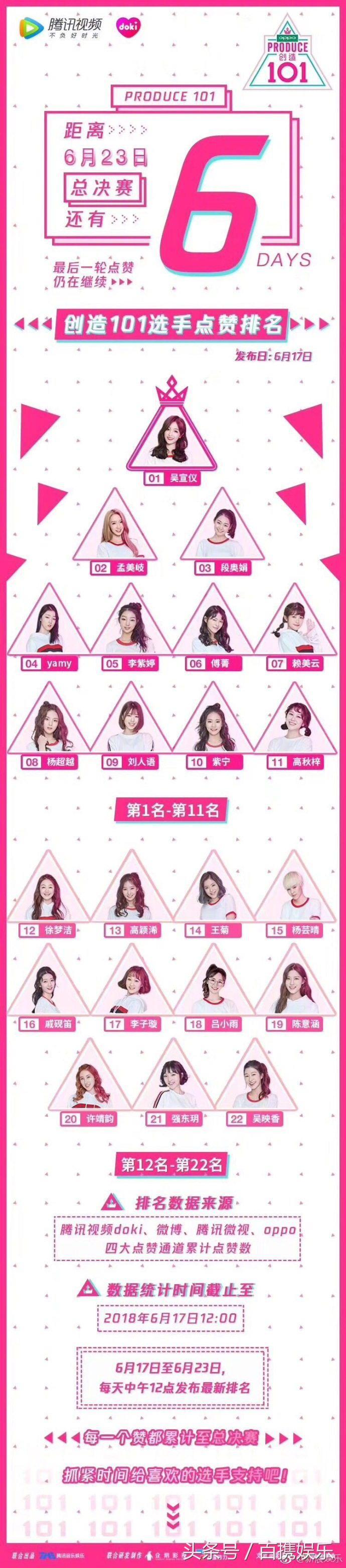 今天,《创造101》更新实时排名,选手的排名再次大改变,前三名分别是:吴宣仪、孟美琪、段奥娟,4-11名是:Yamy、李紫婷、傅菁、赖美云、杨超越、刘人语、紫宁、高秋梓,12-22名是:徐梦洁、高颖浠、王菊、杨云晴、戚砚笛、李子璇、吕小雨、陈意涵、许靖韵、强东玥、吴映香。