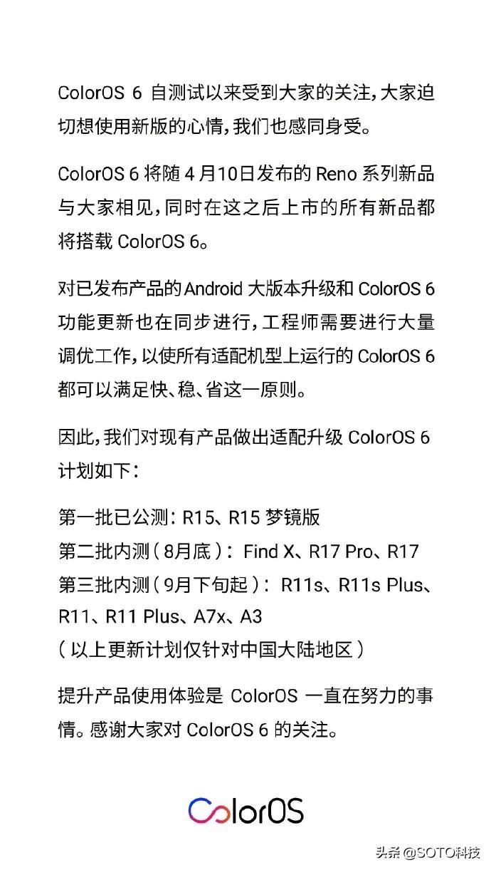 OPPO老机型适配升级ColorOS 6的计划,其计划如下: