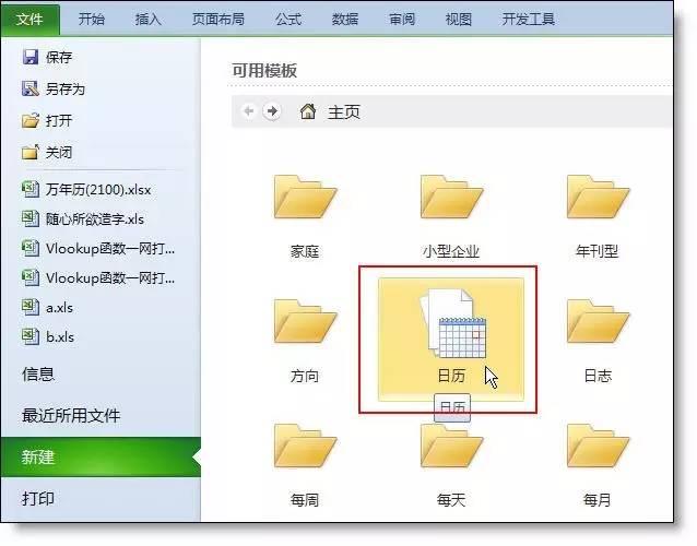excel2010版,文件 - 新建 - 日历