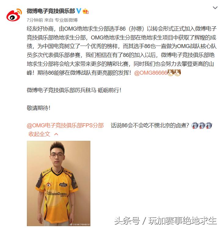 绝地求生:原OMG绝地求生分部选手86加入微博电子竞技俱乐部