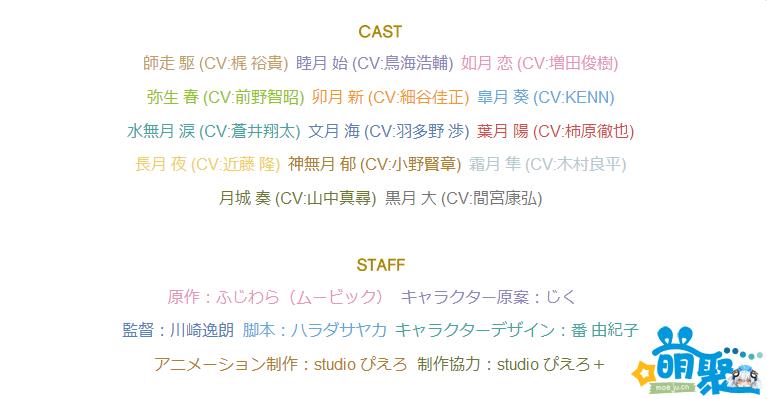 根据月份的印象设计拟人角色以及歌曲的原创音乐系列节目「月歌。」在此前宣布了TV动画化决定的消息,近日本作公开动画开播时间,7月放送开始!主视觉图和部分人设图也随之公开。本作的声优阵容华丽,包括了梶裕贵、金元寿子、鸟海浩辅、今井麻美、前野智昭、细谷佳正、野中蓝、内山夕实、佐藤利奈、羽多野涉、柿原彻也、大坪由佳、近藤隆、小野贤章、木村良平、上坂堇等24位声优。