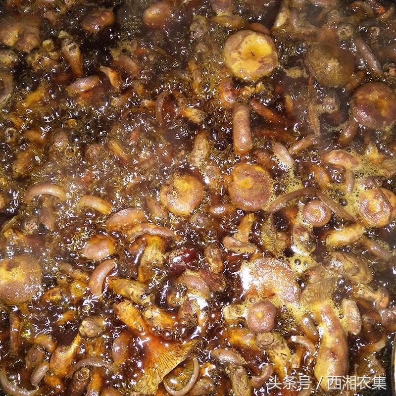 再在锅里加入能漫过枞菌的油,开火进行油炸脱水。油炸1-2个小时后,枞菌伞盖边缘内卷时差不多就可以了。