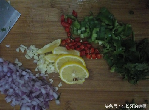 2.把柠檬 、洋葱、 辣椒 、香菜、大蒜切好。