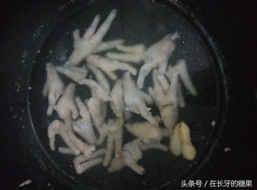 步骤:1.把鸡爪洗净,剪掉指甲,切半。放入生姜,料酒,少许盐。锅中煮15分钟左右。