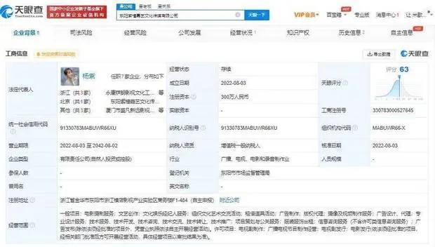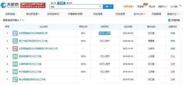 头条娱乐讯 据天眼查APP显示,近日,东阳紫橦嘉艺文化传媒有限公司北京分公司成立,负责人为杨紫,经营范围包含电影摄制服务;文艺创作;文化娱乐经纪人服务;版权代理等。天眼查显示,东阳紫橦嘉艺文化传媒公司成立于今年8月,注册资本300万人民币,是杨紫名下的首家文化传媒公司,此前杨紫关联企业均为个人工作室。