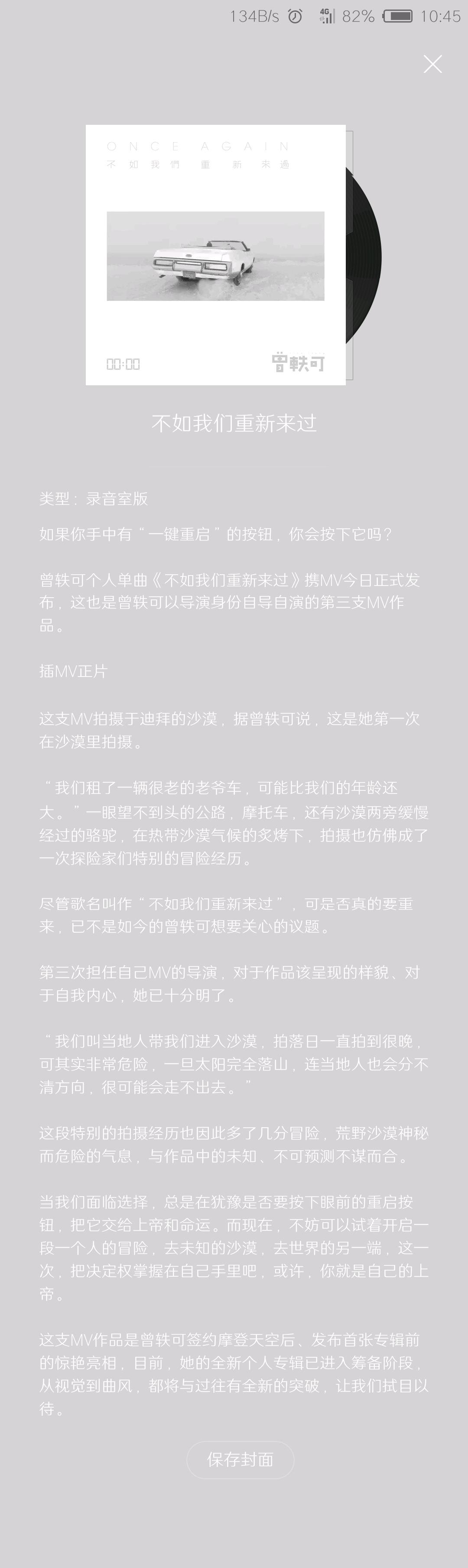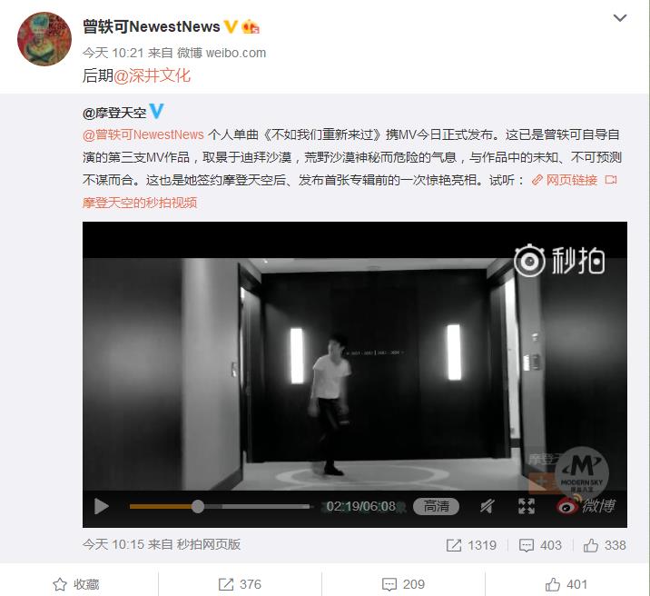 曾轶可个人单曲《不如我们重新来过》携MV今日正式发布。这是曾轶可自导自演的第三支MV作品,取景于迪拜沙漠,荒野沙漠神秘而危险的气息,与作品中的未知、不可预测不谋而合。这也是她签约摩登天空后、发布首张专辑前的一次惊艳亮相。