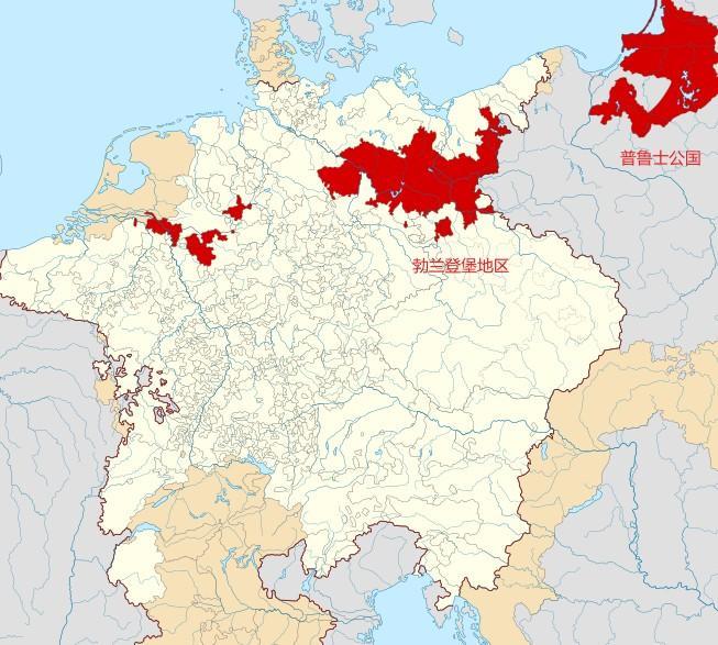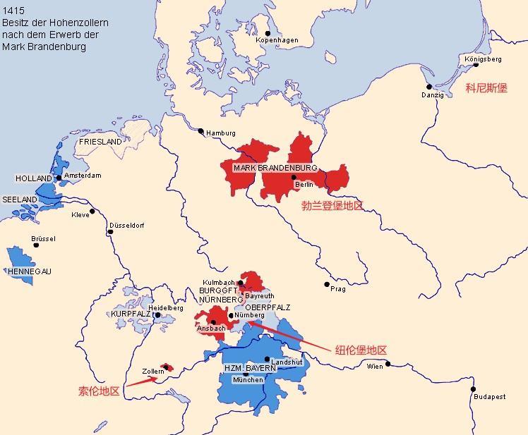 转眼时间到了1415年,纽伦堡伯爵腓特烈六世(Friedrich VI. von Nürnberg)由于协助神圣罗马帝国皇帝镇压波希米亚的胡斯教徒,以及在战场上救驾有功,皇帝将本家族(卢森堡家族)的世袭领地勃兰登堡(德国北部现在的柏林周边地区)赐予腓特烈六世,并授予他为帝国七大选帝侯之一“勃兰登堡选帝侯”(Kurfürst von Brandenburg),获得了选举神圣罗马帝国皇帝的选举权。他也因此改称为勃兰登堡选帝侯腓特烈一世(Friedrich I. von Brandenburg)。从此,霍亨索伦家族终于迎来了质的飞跃,一跃成为神圣罗马帝国的核心家族。