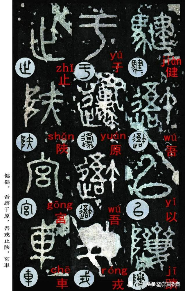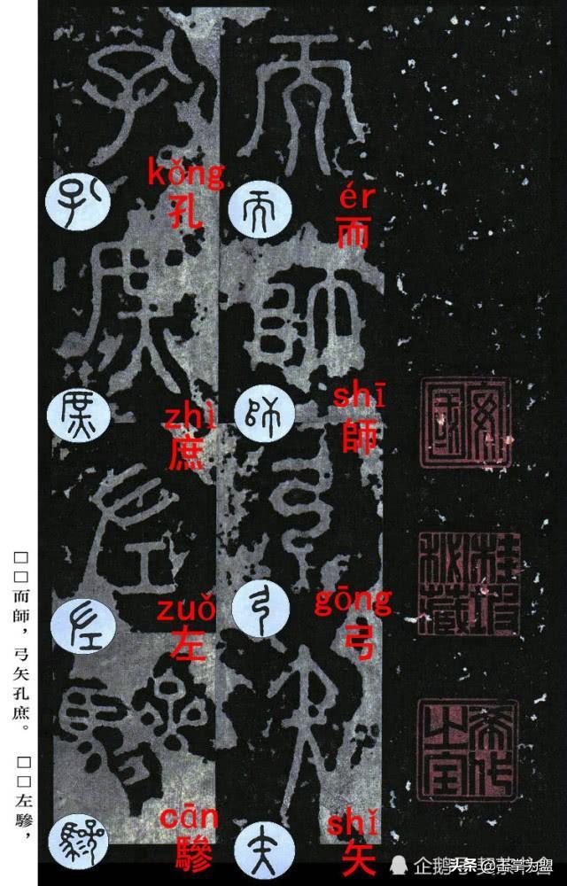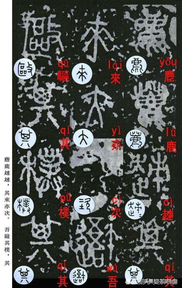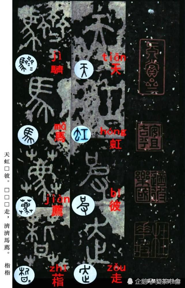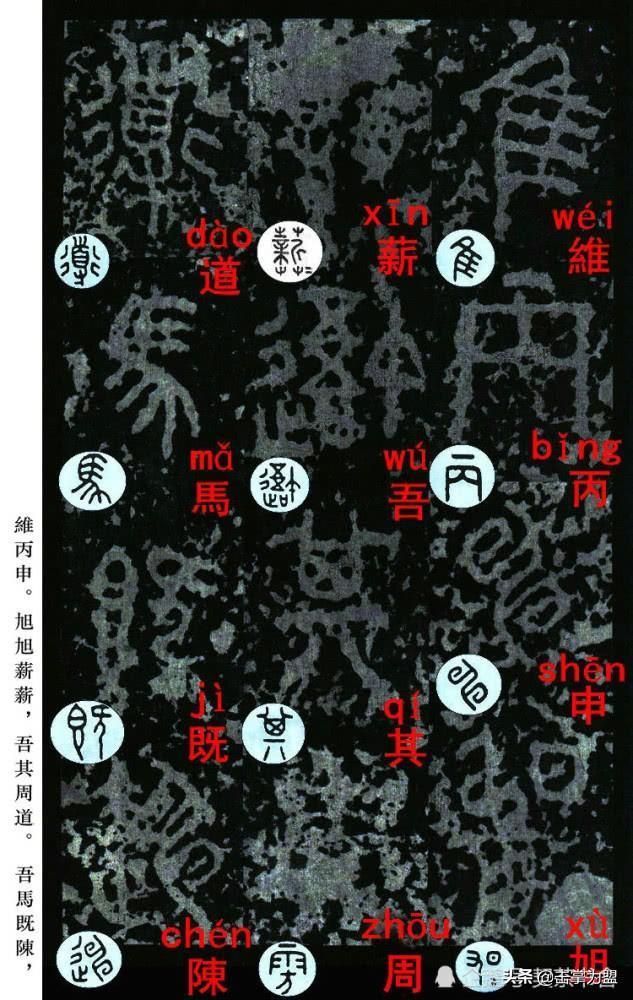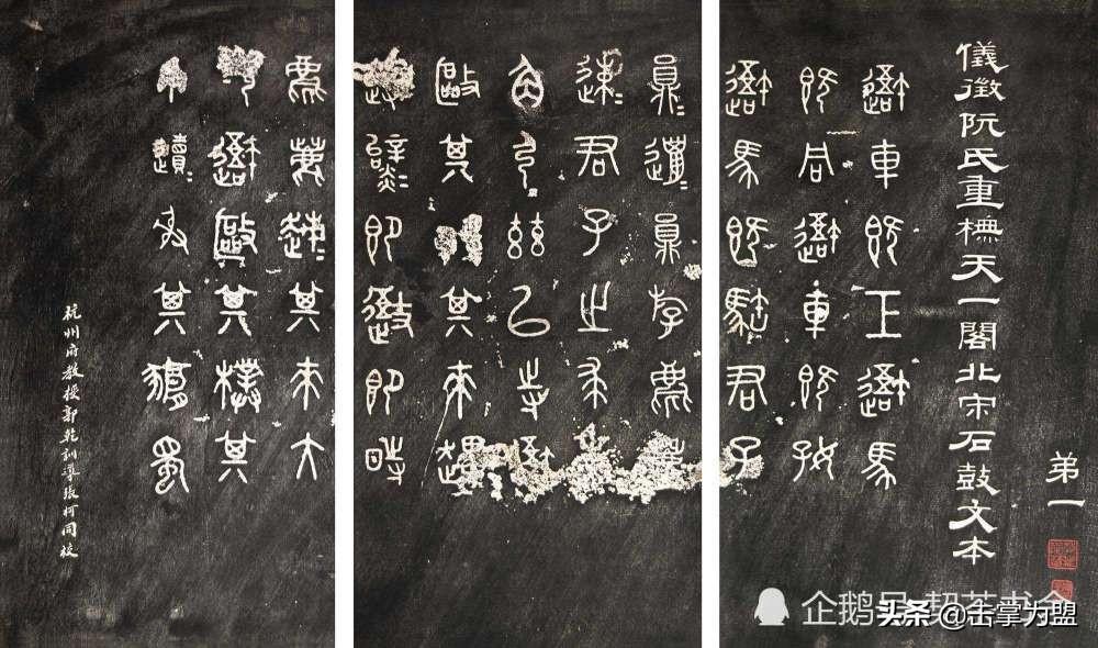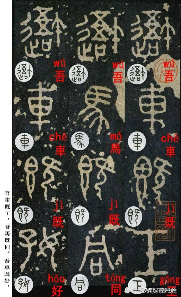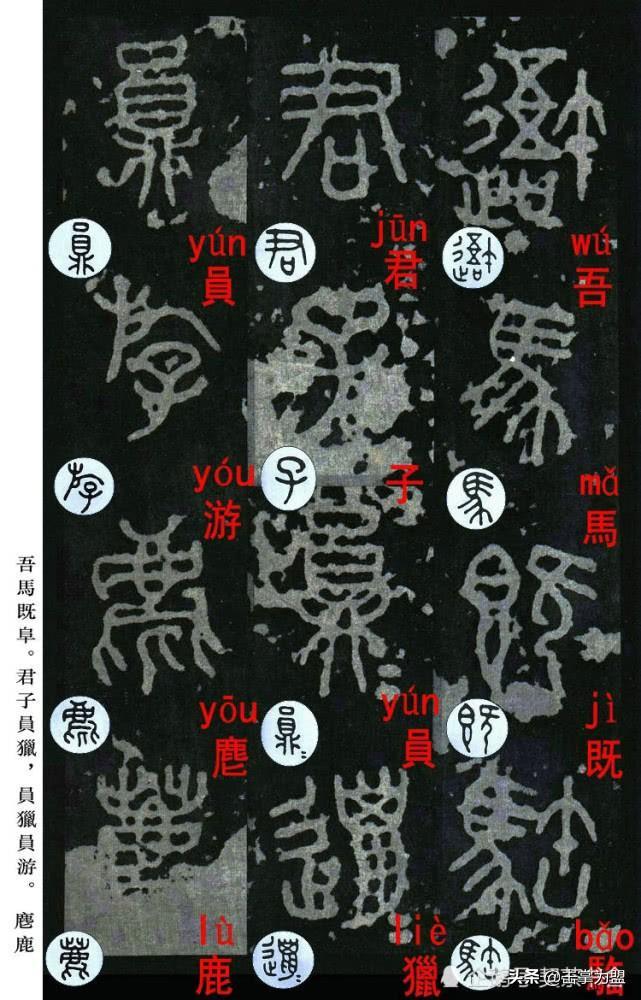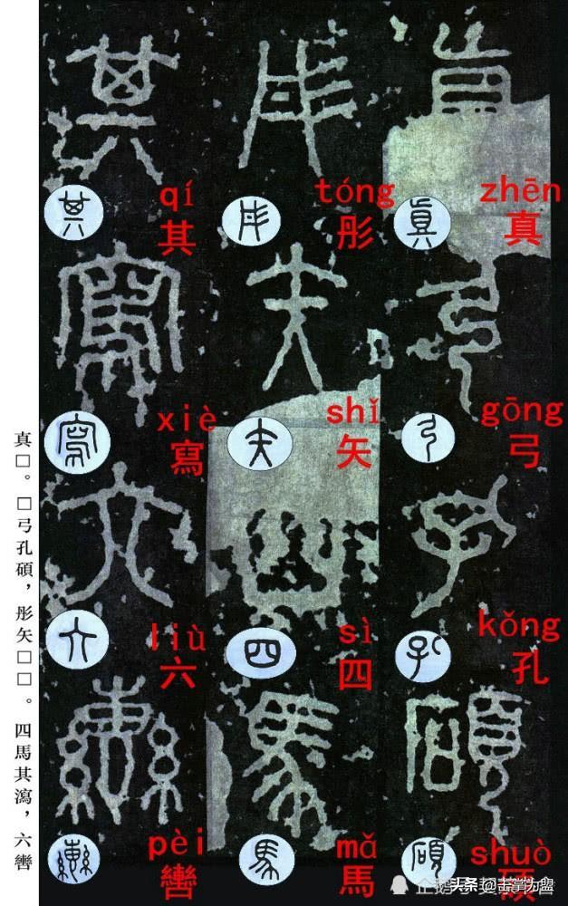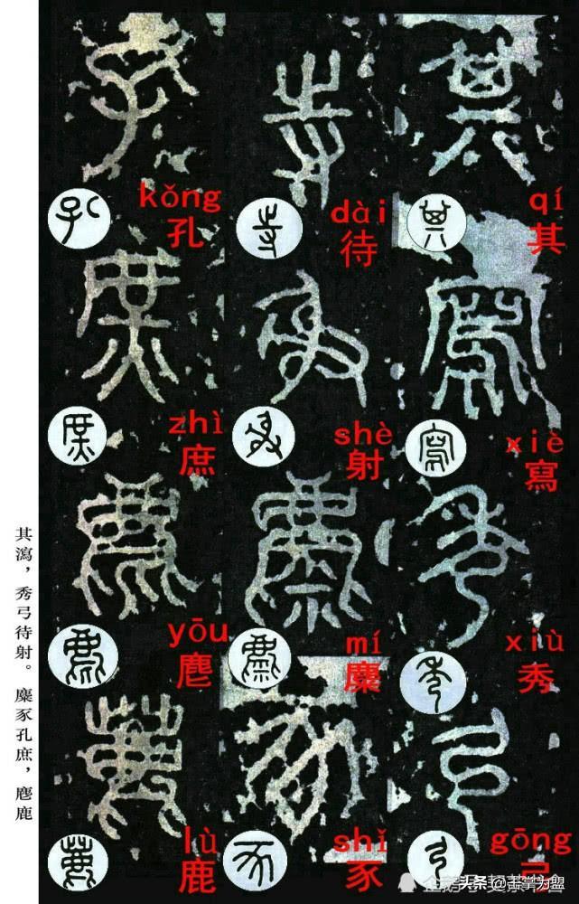 石鼓文最著名的拓本,有明代出版家、藏书家安国所藏后劲本、中权本、先锋本,此三本均为北宋拓本,是世界上保存字数最多、最好的拓本。以下为安氏所藏后劲本附释文,并将王福庵先生所书小篆石鼓文对照排列,以便学者临习。
