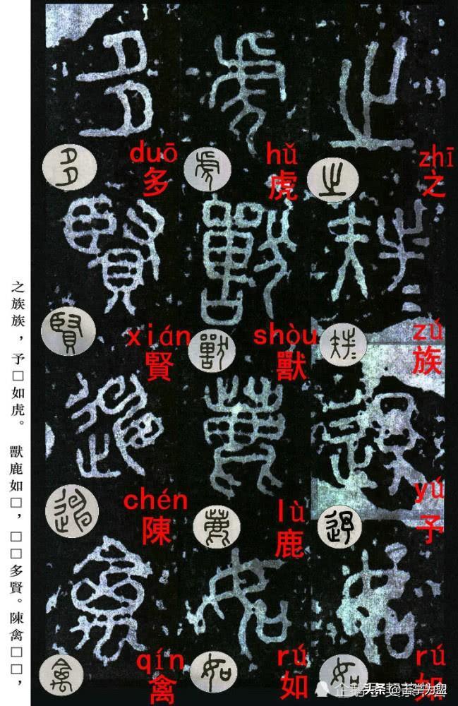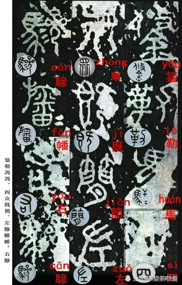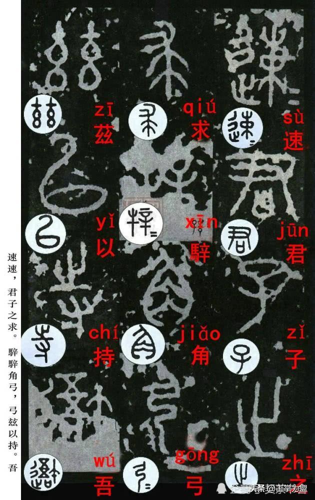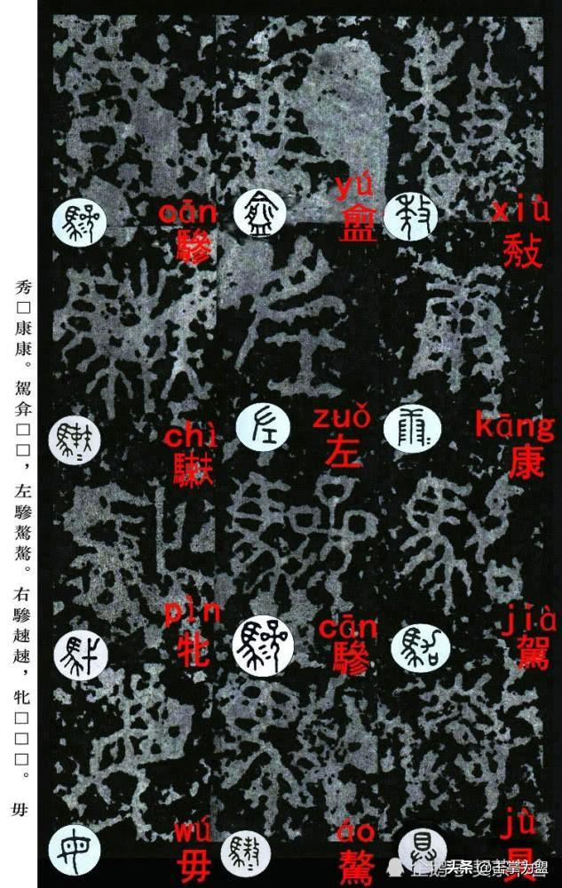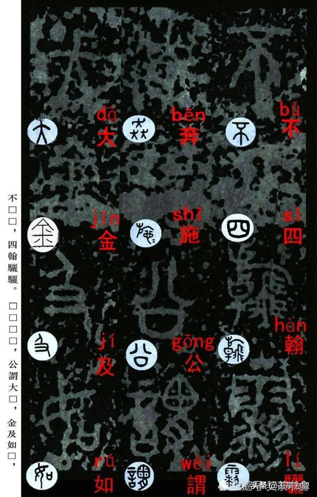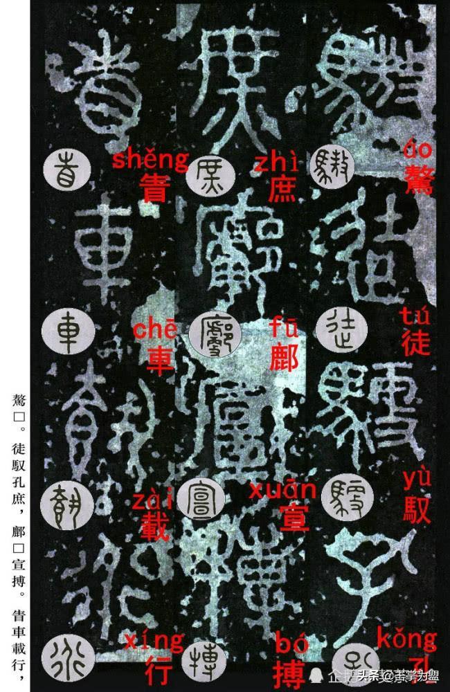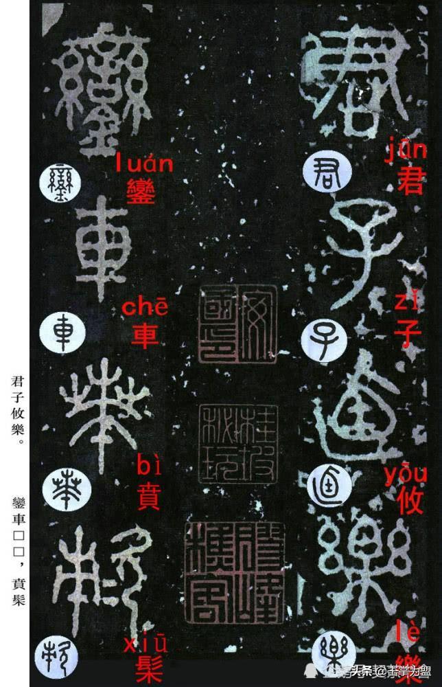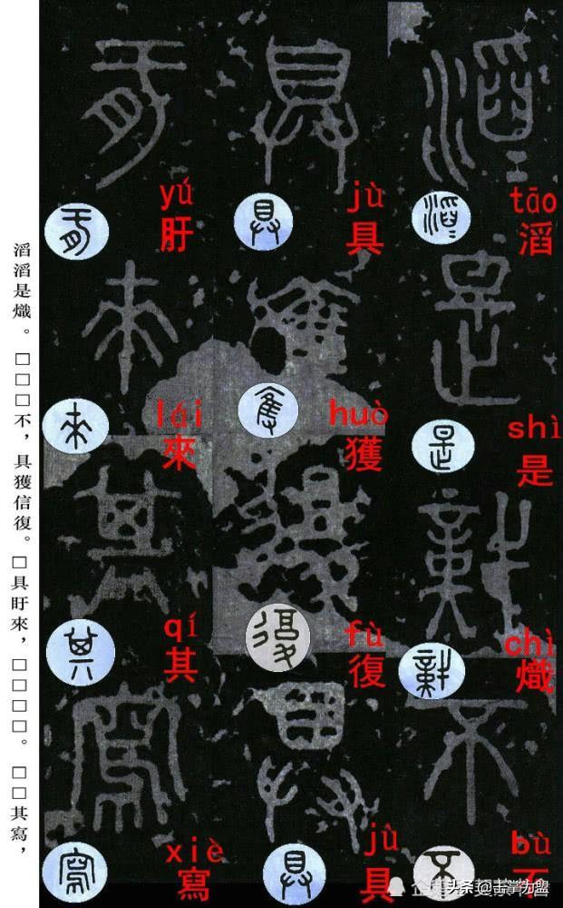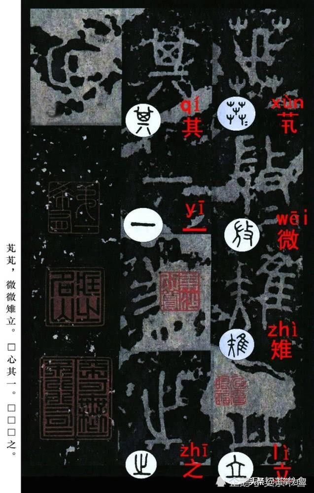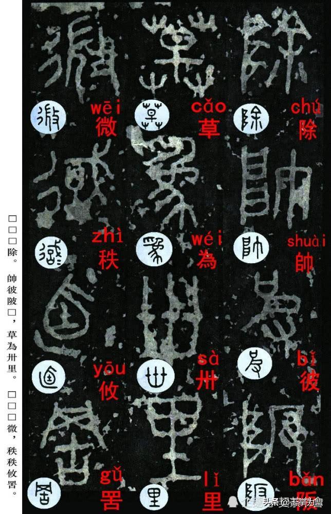 石鼓文最著名的拓本,有明代出版家、藏书家安国所藏后劲本、中权本、先锋本,此三本均为北宋拓本,是世界上保存字数最多、最好的拓本。以下为安氏所藏后劲本附释文,并将王福庵先生所书小篆石鼓文对照排列,以便学者临习。
