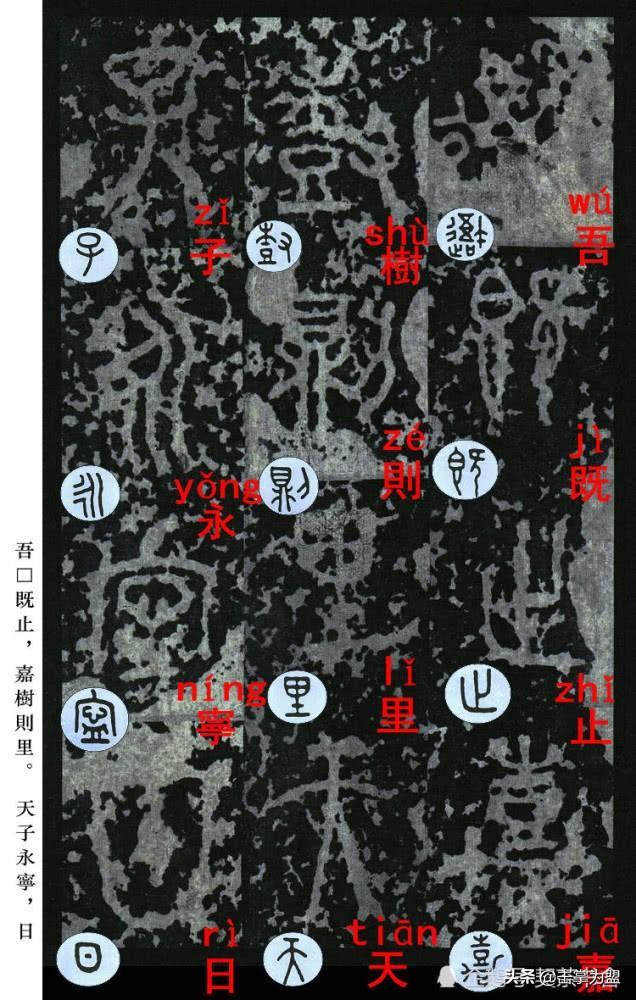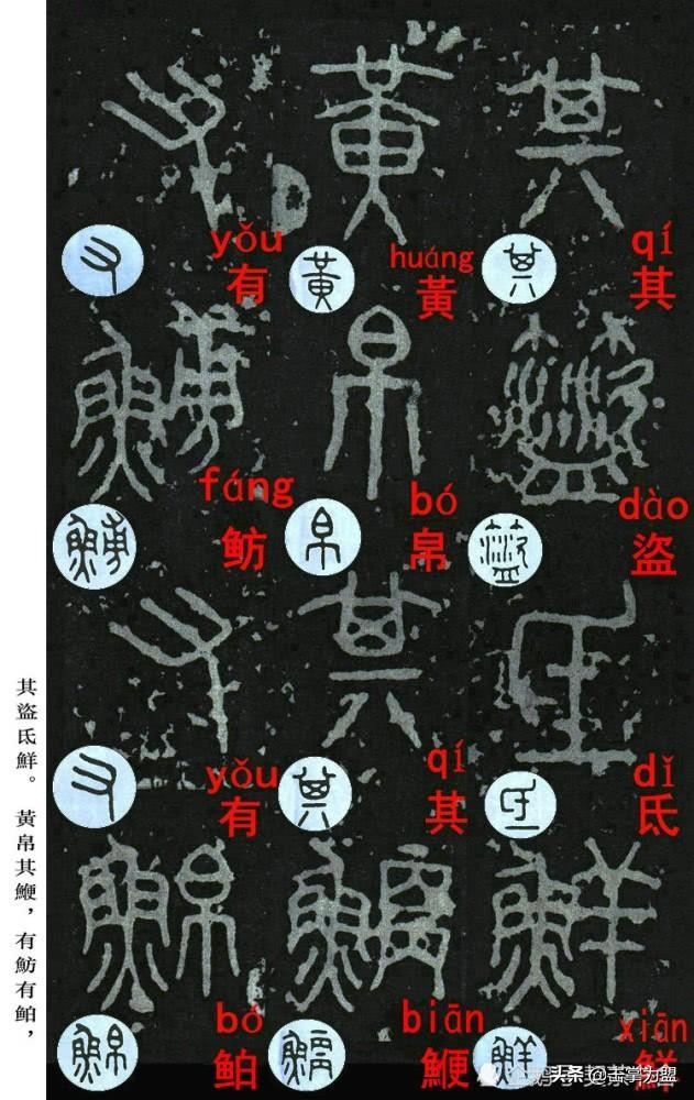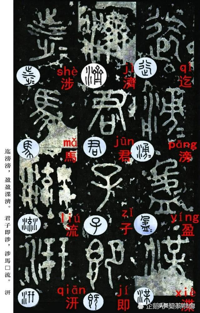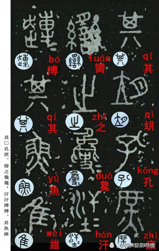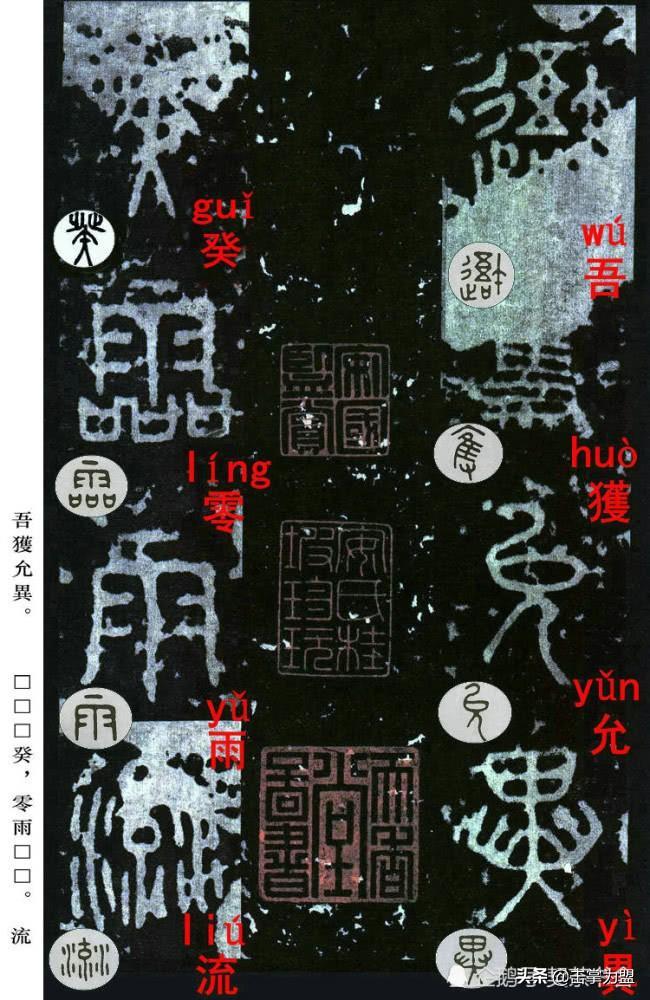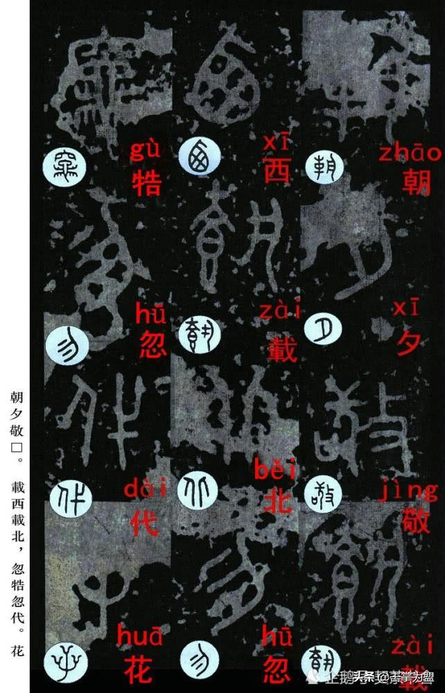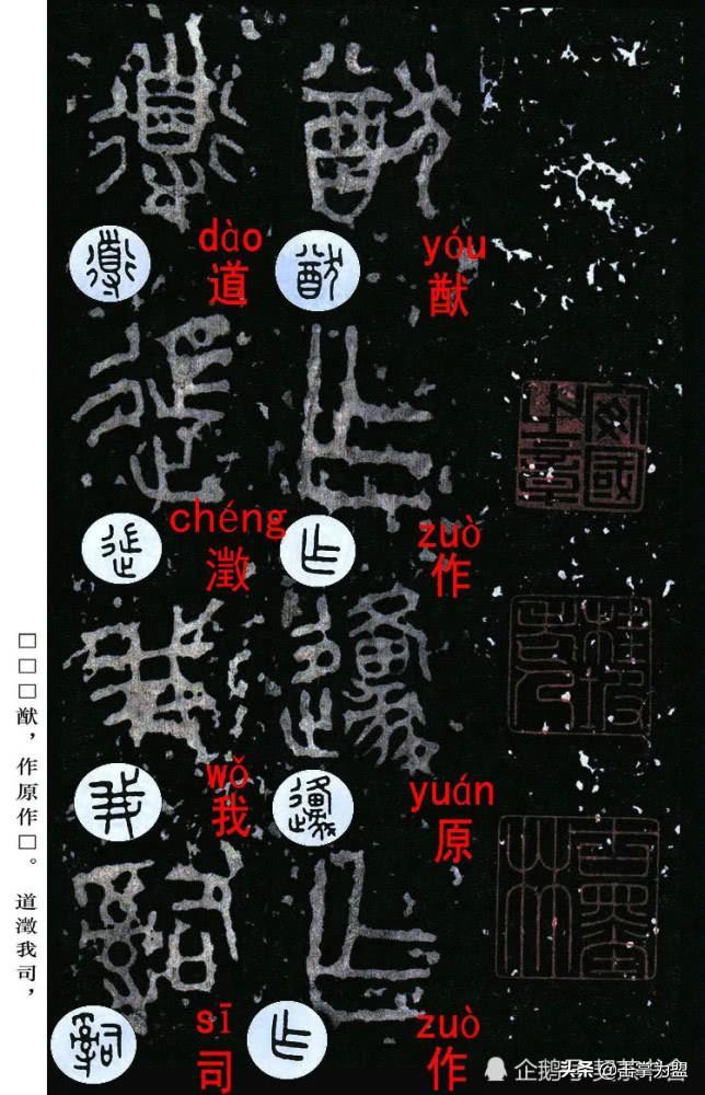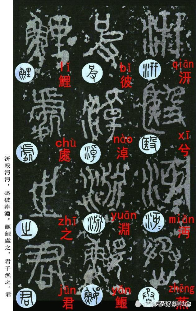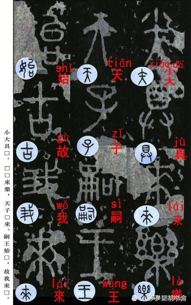 石鼓文最著名的拓本,有明代出版家、藏书家安国所藏后劲本、中权本、先锋本,此三本均为北宋拓本,是世界上保存字数最多、最好的拓本。以下为安氏所藏后劲本附释文,并将王福庵先生所书小篆石鼓文对照排列,以便学者临习。