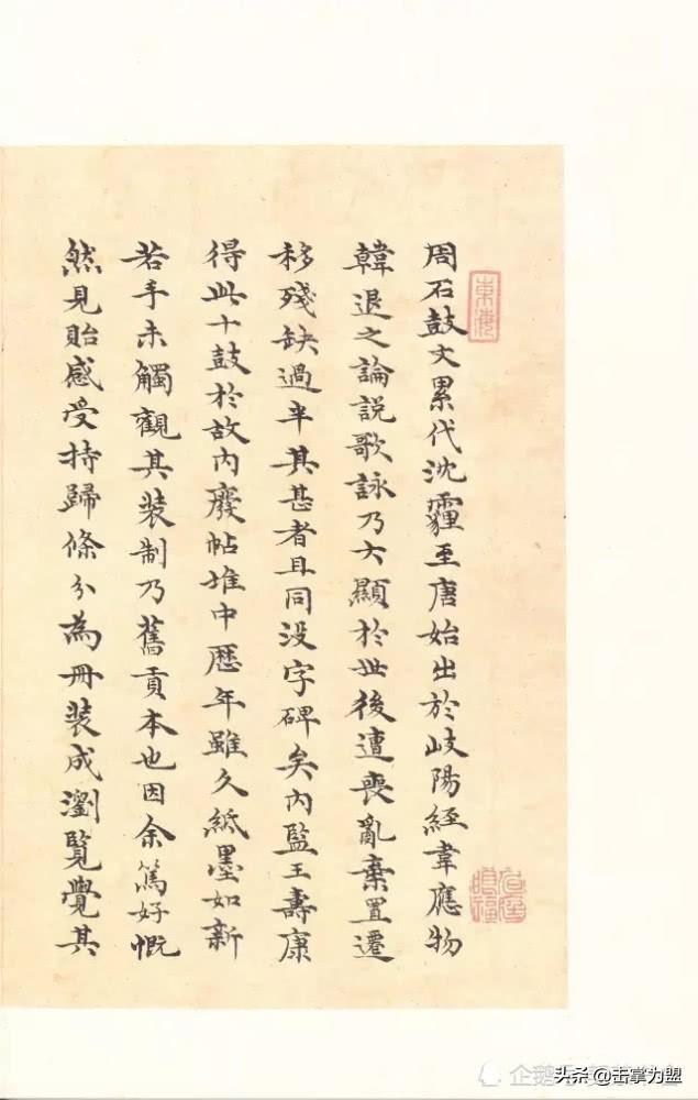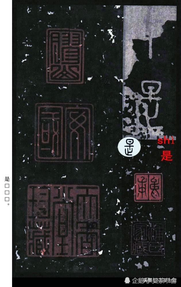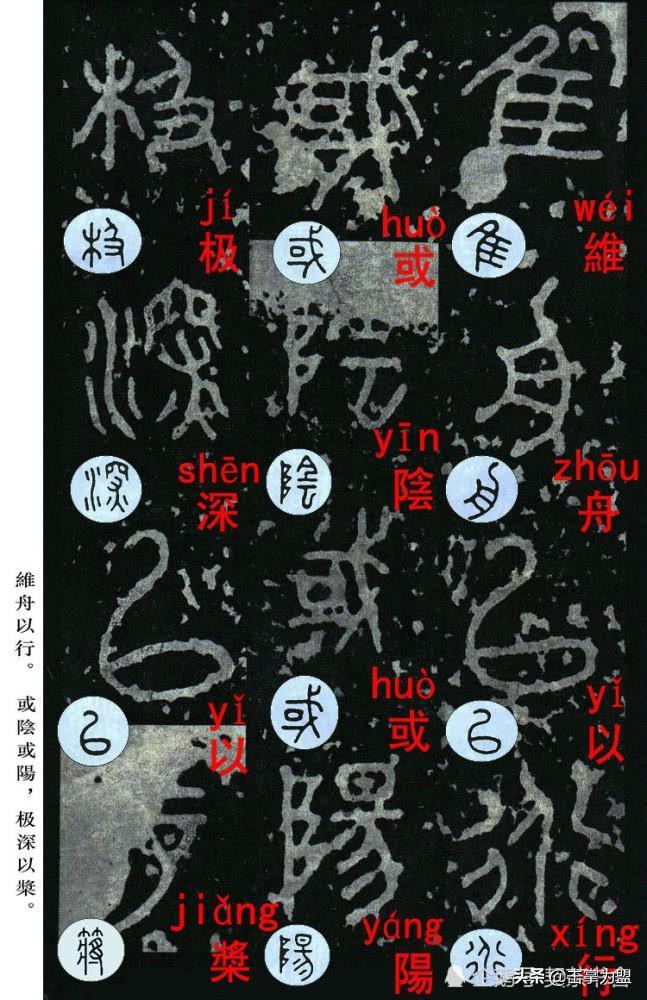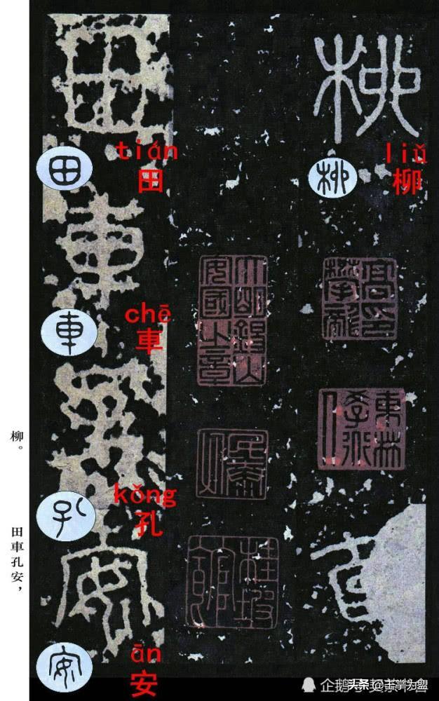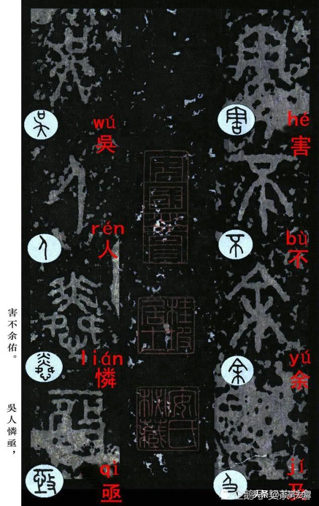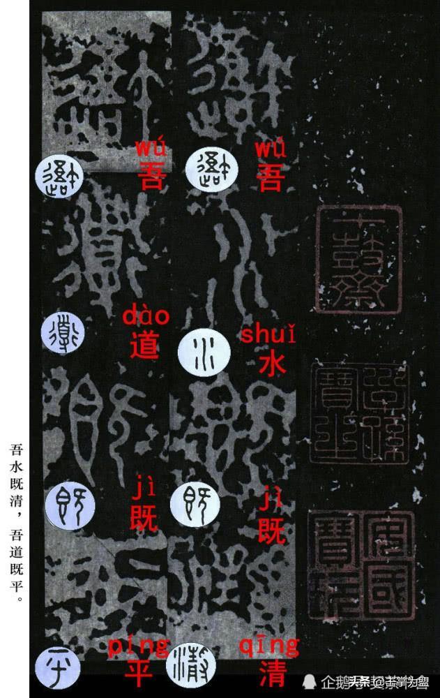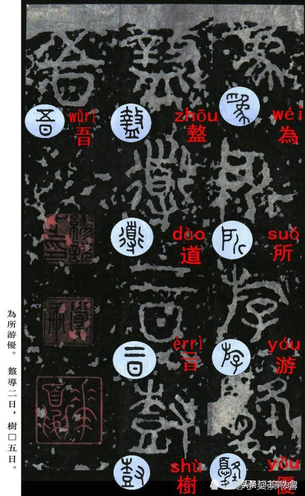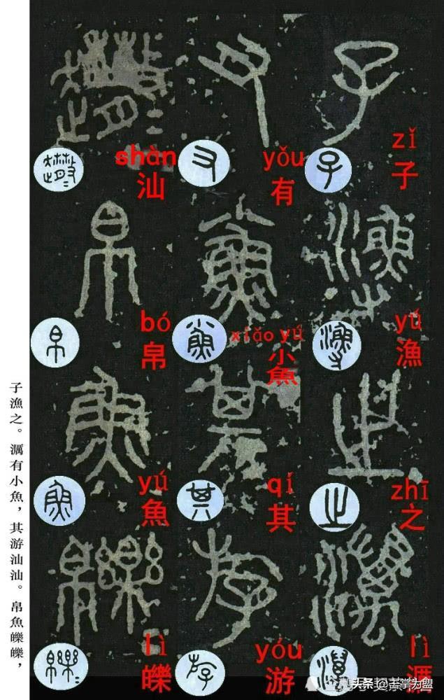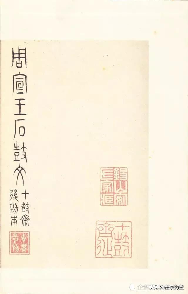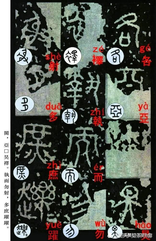 石鼓文最著名的拓本,有明代出版家、藏书家安国所藏后劲本、中权本、先锋本,此三本均为北宋拓本,是世界上保存字数最多、最好的拓本。以下为安氏所藏后劲本附释文,并将王福庵先生所书小篆石鼓文对照排列,以便学者临习。