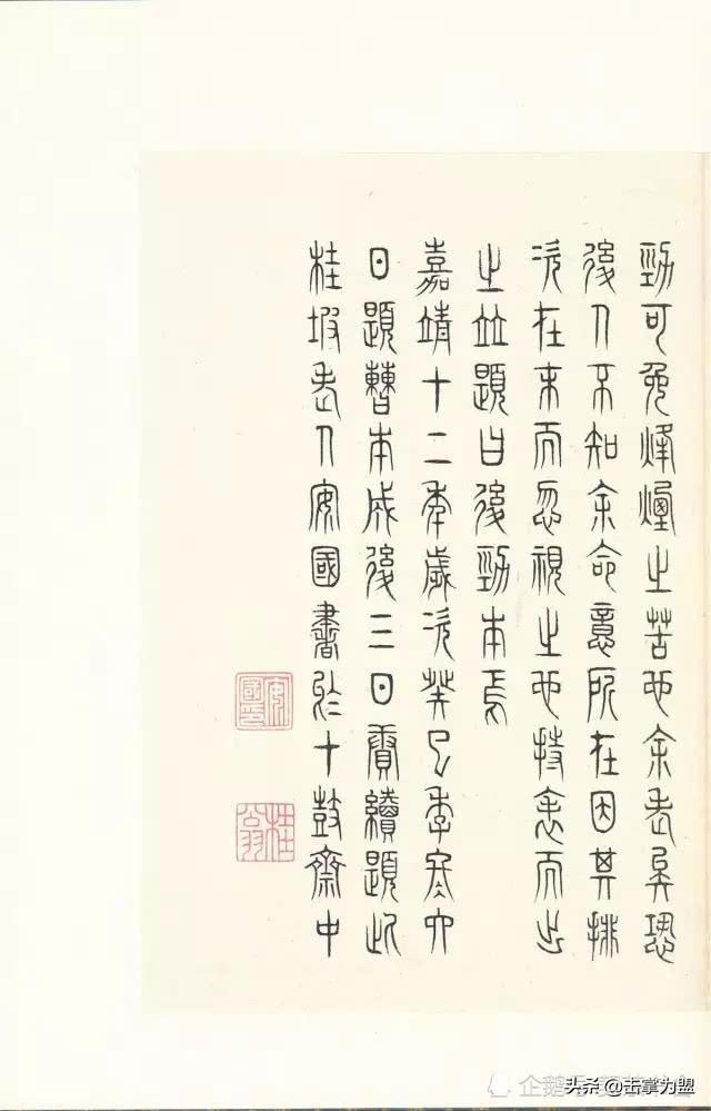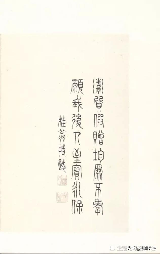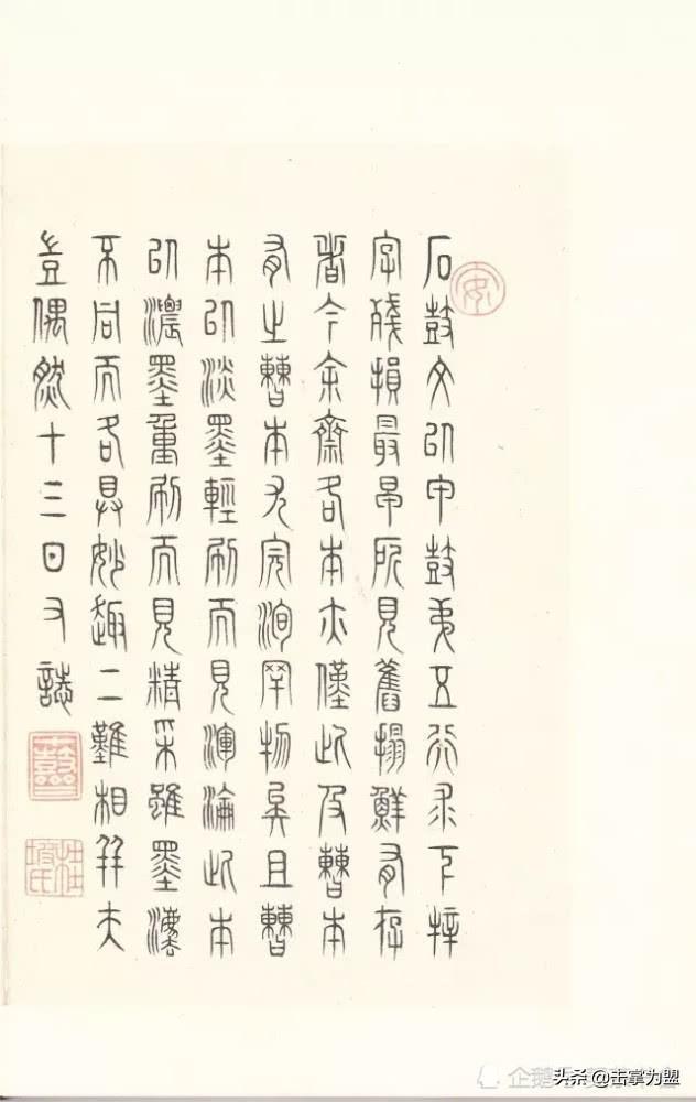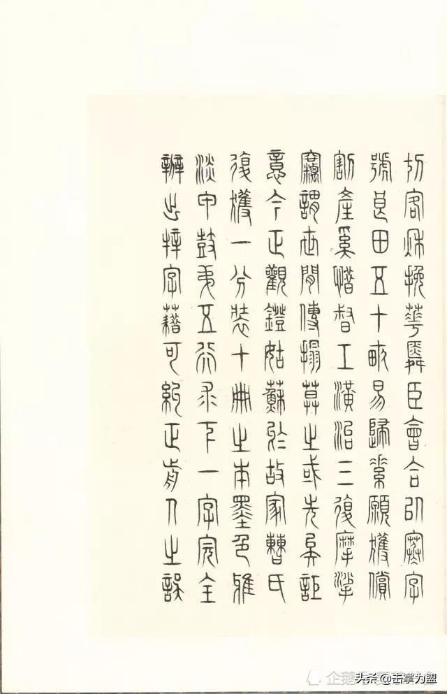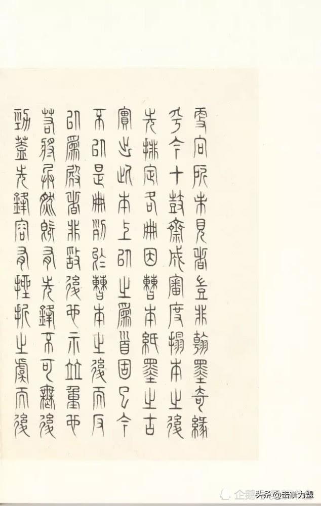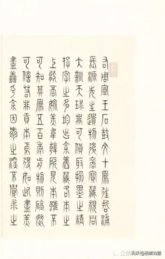 石鼓文上承西周金文,下启秦代小篆,是由大篆向小篆衍变而又尚未定型的过渡性字体。其书端庄严谨、凝重浑劲,用笔起止藏锋、笔力稳健,结体促长伸短、匀称适中,其势风骨嶙峋、楚楚风致。古茂雄秀,冠绝古今,与大清气势相得益彰。