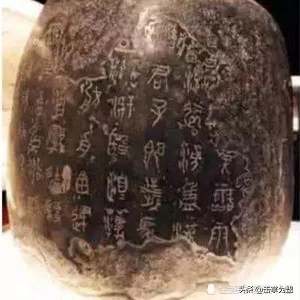 石鼓文,春秋战国时秦国刻在石头上的古老文字,因其刻石外形似鼓而得名,被认为是中国最古老的文字(当时尚未发现甲骨文),世称“石刻之祖”。内容最早被认为是记叙周宣王出猎的场面,故又称“猎碣”。石鼓文发现于唐初,共十枚,高约三尺,径约二尺,分别刻有大篆四言诗一首,共十首,计七百一十八字。原石现藏故宫博物院。