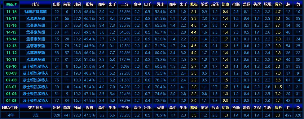托尼-阿伦生涯使用率为18.7%,最高的是06—07赛季的22.1%,也和上文提到的一样,这个赛季他确实展现出了一定的实力,而恐怕令人意想不到的是,托尼-阿伦整个生涯的使用率极其稳定,从未低于16%,也说明了他在球队中确实占着重要的角色地位。生涯防守效率达到了恐怖的102,这是极其出色的表现,PER值为14.2,最高的是10-11赛季的18.3,而这年是他来到灰熊的第一年,不仅防守好,进攻效率也是生涯最高的110,从这一年开始,在灰熊的7年时间,托尼-阿伦获得了6次最佳防守阵容,仅13—14赛季没有入选。
