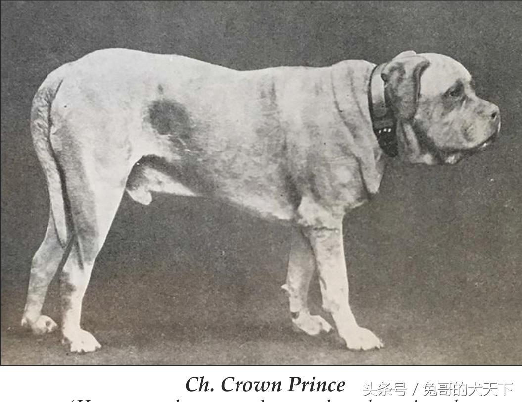 它常被用做种犬,而且还在继续,在许多情况下,它把它最严重的缺陷都遗传给了子孙后代,把优点都留给了自己。(如果你看一下Crown Prince的照片,你会发现它还有跗关节直,不出所料,这是一个可怕的搬运工。)Crown Prince 可能比它之前的几乎所有的马士提夫都更紧凑、更短、更短。这种新奇的外观引起了巨大的需求。因为它的功劳,忽视了所有其他的可用性,所以在很短的时间内,繁殖者发现很难找到与它无关的马士提夫。