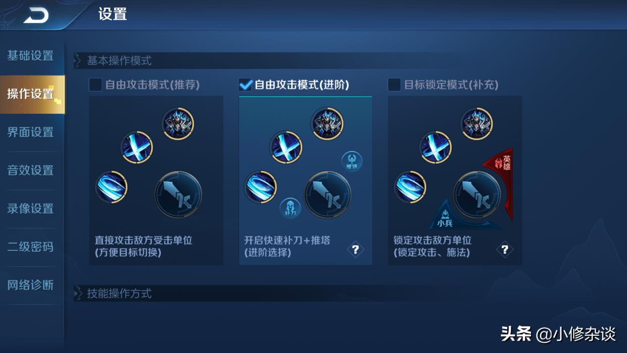 为了更快捷击杀掉小兵,你需要在设置里,调整操作模式。除了自由攻击模式外,其它两个模式都非常适合清兵,个人推荐第三个目标锁定模式。