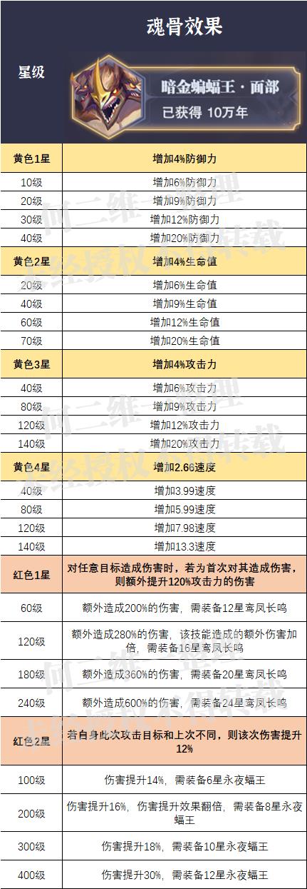 红色1星:这里的额外增伤可比刚刚我们才分析了的强攻系吞星魔元兽魂骨的红1效果更加突出,当然敏攻系主打单人伤害的特点也是决定了这个伤害差异的本质原因,而此功能也是一个在短图或PVP中较为有效的效果,对于邪月、柳二龙、朱竹清等短图敏攻系魂师来讲会有一定的效果红色2星:这里的伤害提升条件其实还是有点苛刻的,毕竟在很多短图PVE副本里我们都是主要在打单人boss的,不过考虑到【永夜蝠王】的再次行动效果,在暗器千劫猫短图队中,这个红色2星的效果或许会有一定的表演空间