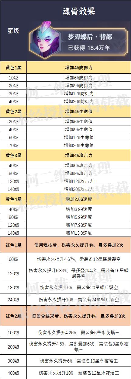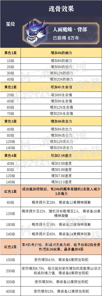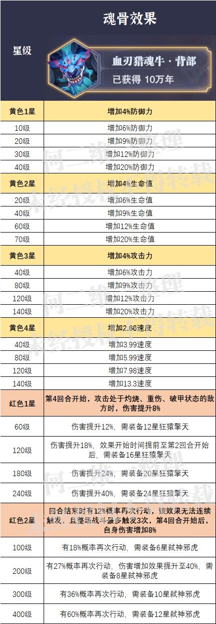 首先是血刃裂魂牛的背部外附魂骨,考虑到大部分外附魂骨在黄色1星-4星时的魂脉核心效果基本上都是一致的,因此我们就直接从红色1星开始分析魂脉的具体效果和适配性:
