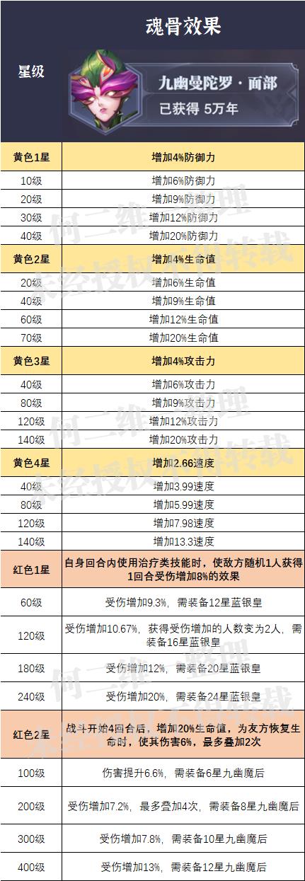 红色1星:使用治疗技能便能增伤,看似效果不错,但其需要同时装备【蓝银皇】套装才会奇效,大家都知道【蓝银皇】套装其实是更加适合于防御系魂师的魂骨,所以理论上更能增伤和回复生命的辅助系魂师便不太适配这个魂骨套装,不过部分大佬玩家也可以无视这点红色2星:这里和之前的琉璃七玄鹿套装一样,毕竟【九幽魔后】魂骨套装在防辅系魂师中的适配度并没有特别好,外加红色2星的高门槛,这里的增伤效果目前来看也只是部分大佬玩家们的玩具之一