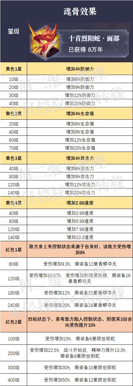 红色1星:首先这个控制增伤的效果其实和【言灵】通用魂环也有一定的联系,不过一般玩家想要长时间持续对敌方施加控制效果也不是很容易,目前比较主流的控制增伤魂师波赛西、胡列娜和火舞虽然都有控制能力,但持久性却是他们的一大问题,其中胡列娜通过带1111魂环套装不断使用1-1技能应该可以有一定的持续性,另外2位想要达成这个效果则会有不小的难度红色2星:这里的增伤增伤效果需要我们在烈阳状态下才能起效,虽然客观说进入烈阳状态并不难,但是其冷却时间却是一个不小的麻烦,毕竟12星的【陨世阳蛇】套装都会有3回合的【烈阳】冷却,所以这里的增伤虽然很美,但考虑【陨世阳蛇】的套装属性和控制系魂师的普遍练度,这个红色2效果更多也是一个花瓶的作用