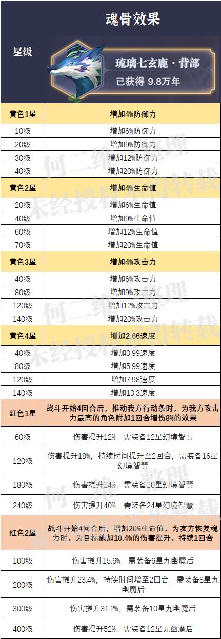 红色1星:推条便能提升我方攻击力最高魂师的伤害,同时是装备辅助系魂师的专属魂骨【幻境智慧】起效的,因此这个红色1星的效果大家可以多多关注下,例如长图队伍中的绛珠、白沉香、鬼魅等都可以很好的享受到这个效果红色2星:考虑到防辅系魂师魂骨的练度和特点,其实一般来说维一都建议辅助系魂师佩戴6件套的【幻境智慧】来积累出24星的套装效果,当然如果你是大佬玩家的话就另当别论了,所以辅助系魂师带【九幽魔后】套装的概率并不会很高,因此这个套装效果虽然不错,但也只是针对大佬玩家手中的绛珠、鬼魅等魂师而设了