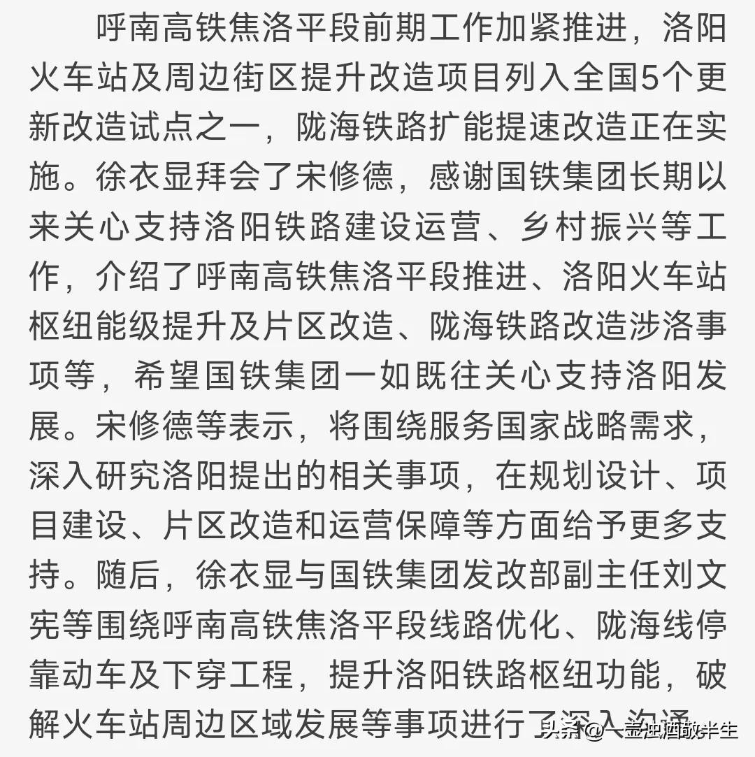 这一切离不开洛阳网友的急切呼吁,也不离开洛阳政府的奔走努力。无论是市里还是普通民众,都意识到铁路交通成为阻碍洛阳腾飞的顽疾。在国铁集团刚刚更换新掌门之后,洛阳的当家人,马不停蹄前去拜会,沟通探讨洛阳铁路方面的问题,以期得到国铁方面对洛阳实质性关注。这也许是国铁新换老总后,第一位拜会的知府吧。说明洛阳的父母官还是肯干事,爱办事的。只有事事跑在前面,拿出积极性,甭管能不能成,也能博得别人的关注是吧!