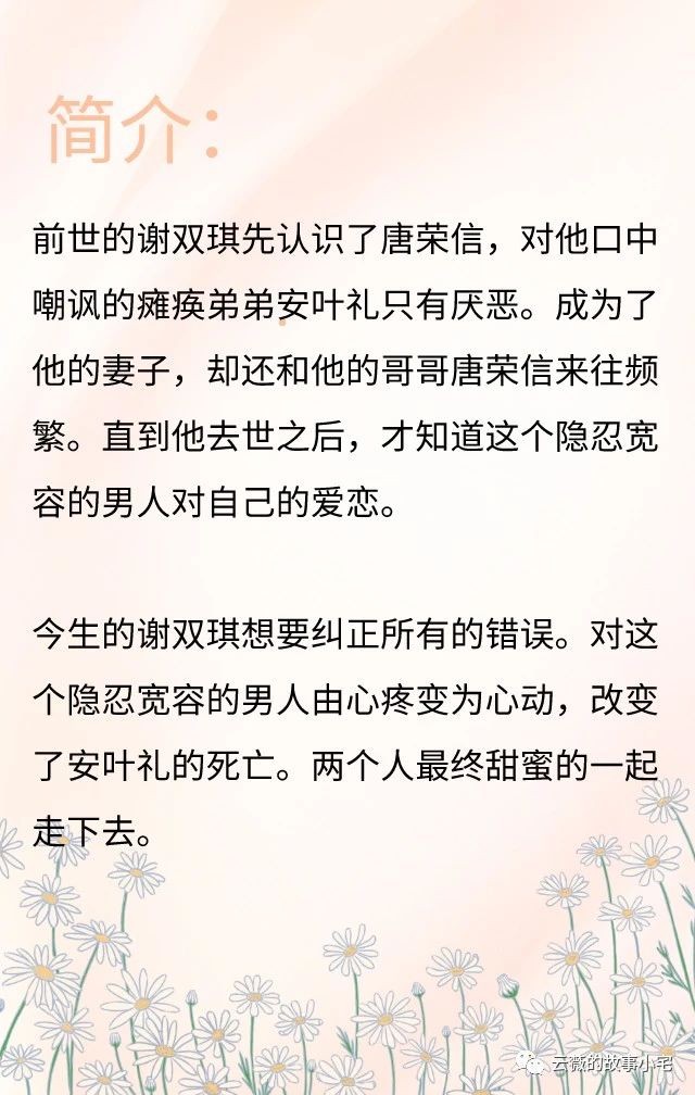 短评:经典重生悔恨文,女主死后才认识到男主对她的好,才知道自己一直信任的“恋人”其实一直是个渣男。重生回来后,她改过自新,纠正所有的错误,重新审视自己的老公,渐渐沉沦。男主残疾但很霸道总裁,女主不小白,剧情偏温馨,值得推荐。
