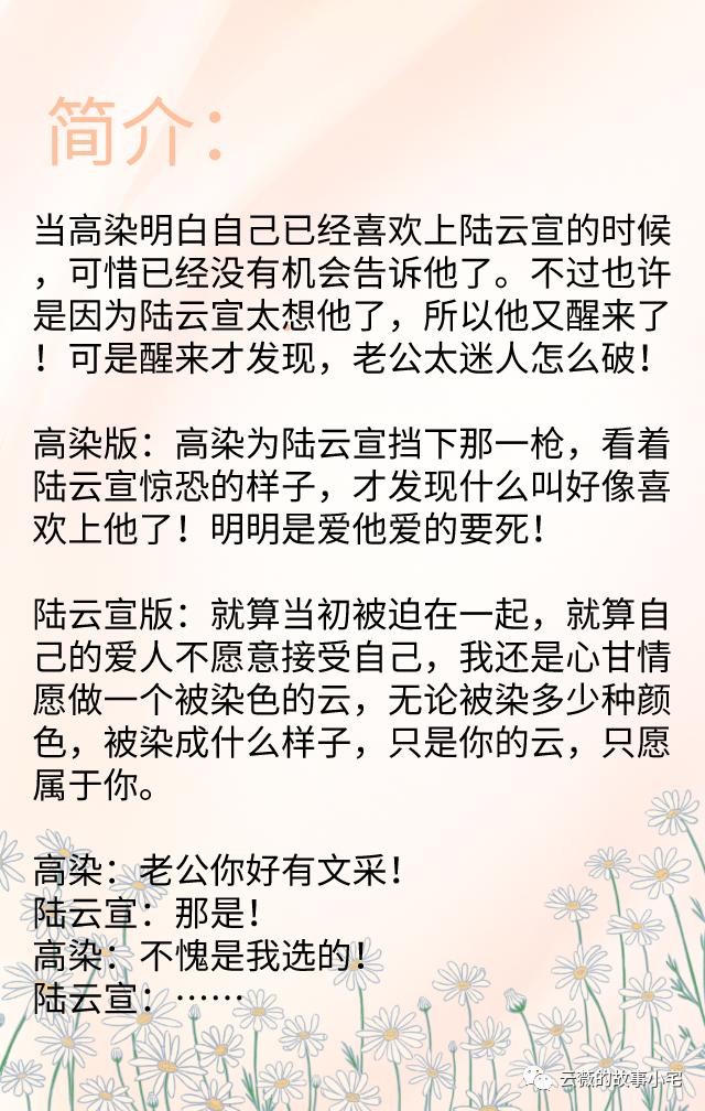 短评:满足重生宠文的设定,高染后知后觉在死前才明白自己是爱着陆云宣的,重生回来疼老公、宠儿子,势必将幸福生活进行到底。不过要告诉大家的是,这是一篇耽文,是腐女的值得推荐。