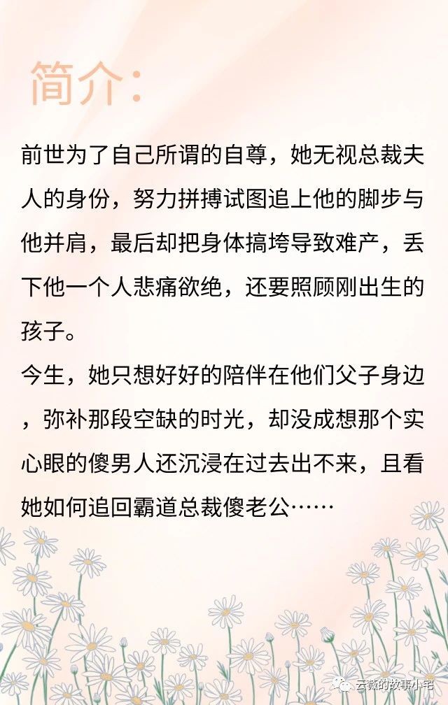短评:女主属于婚后重生,前世死于难产,男主一直怪女主为了孩子放弃生命,所以女主重生后哄了好久才让男主放下芥蒂。小说中还有一个巨可爱懂事的乖宝宝,牵动着男女主角的发展,剧情简单,温馨向,没有太多的勾心斗角,值得推荐。