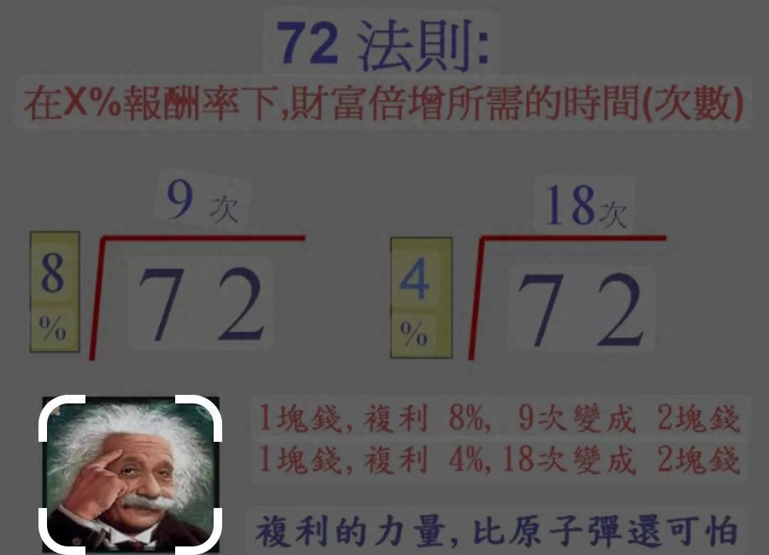 "72" 的确是一个神奇的数字,投资中,复利效应的威力遵循一个叫做 "72 "的法则,简称为 "72法则" ,它就是用数字72除以年收益率,就可得出一笔投资资金翻番的时间(即回收投资成本的时间 ),为了具体说明情况,特举例如下 ---