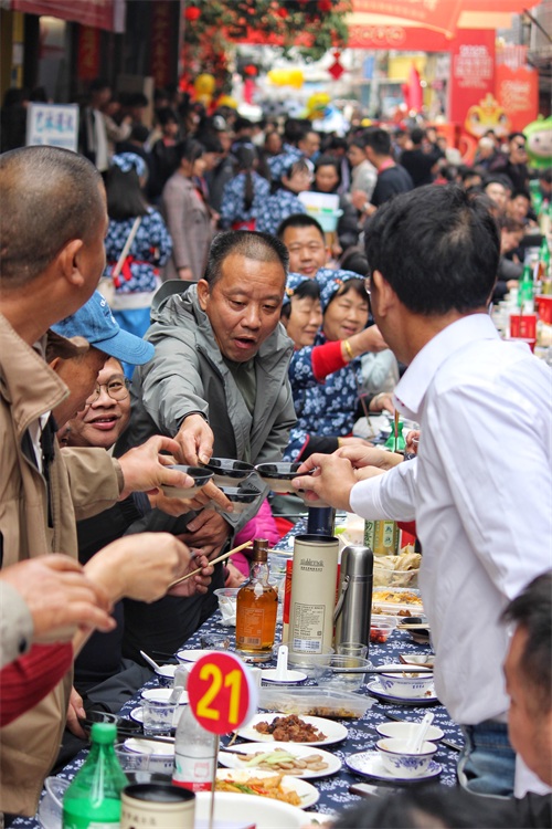 大家围坐在长桌旁,一边品尝着美味佳肴,一边亲切地交流着。现场气氛热烈,欢声笑语不断,浓浓的情谊在人们之间传递。两位来自南京的游客兴奋地说:“这样的长桌宴太棒了,在南京,平时大家都很忙,很少有机会这样聚在一起。今天不仅能品尝到这么多美食,还能体验到和客家邻居们聊天、拉家常,感觉特别温暖,明年初五我带上我家人来参加。”