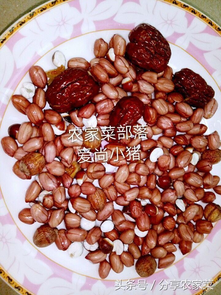 花生100克,去核红枣3个,当归1片,茨实和莲子少许,这两者可有可无。生姜片适量。