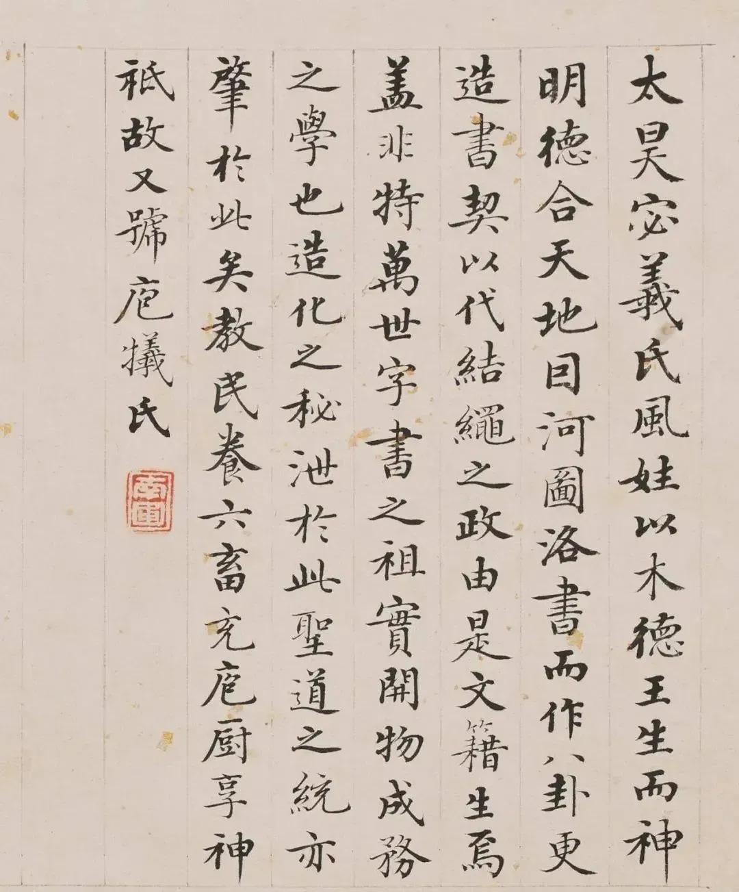 太昊,宓义氏,风姓,以木德王,生而神明,德合天地。目河图洛书而作八卦,更盖非特万世字书之祖,实开物成务之学也。造化之秘泄于此;圣道之统亦肇于此矣。教民养六畜,充刨除,享神祇,故又号庖犠氏。
