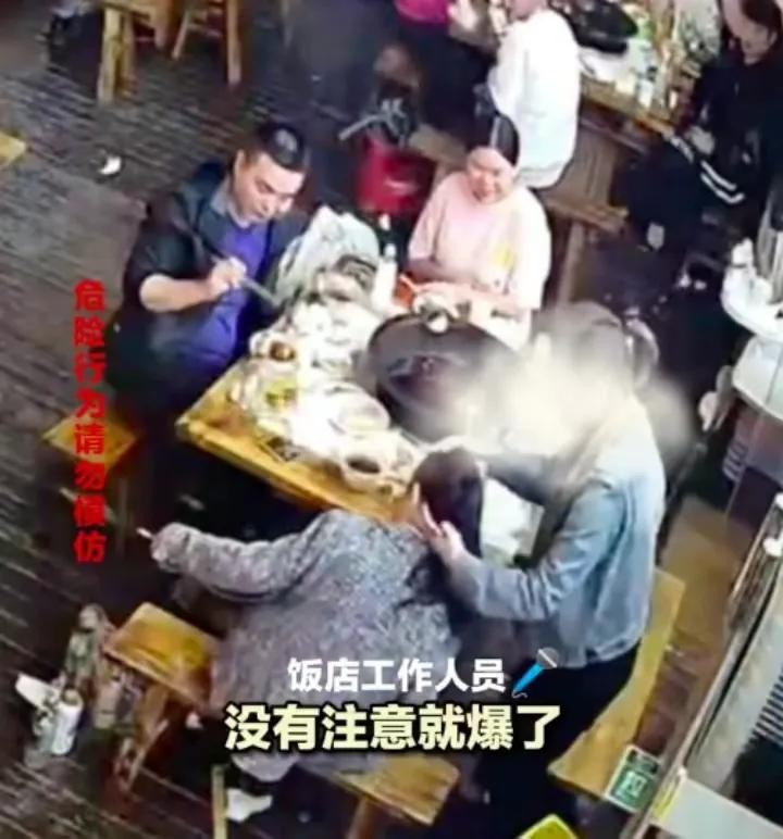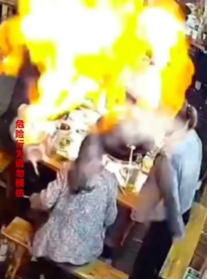 监控录像显示,当时四人正在饭店用餐,其中一女子背后有一个巨大的粉色氢气球。突然,同行的女子拿出打火机,在气球下方点了一下。随后,气球立即发生爆炸,巨大的火球腾起,将坐着的女子笼罩。