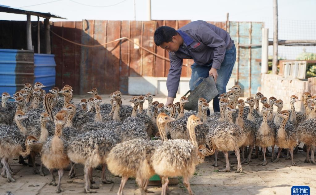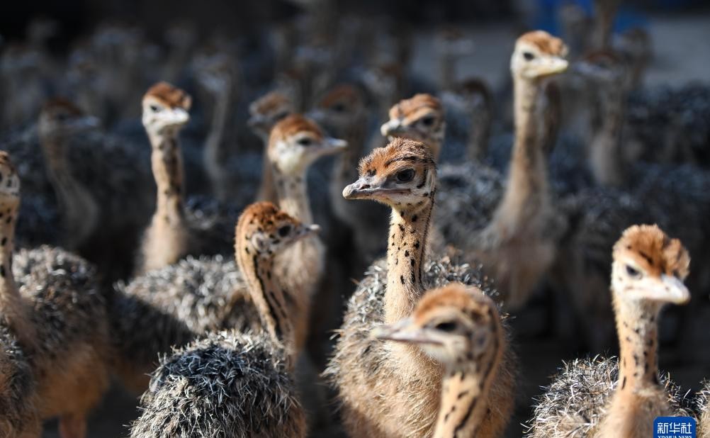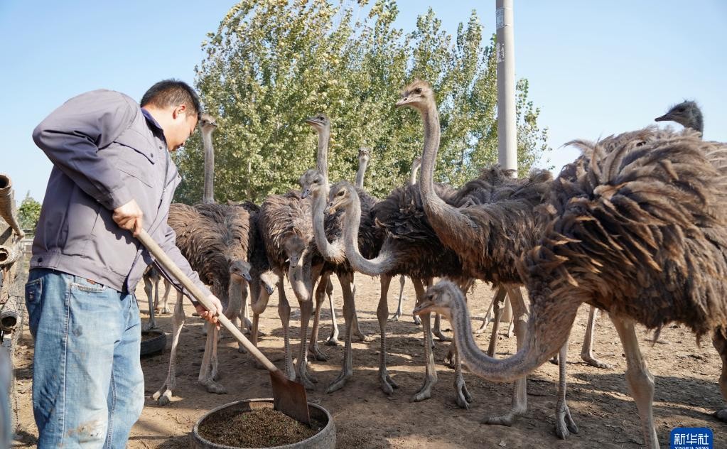 在小辛庄乡的辛南鸵鸟养殖园,工人们正在给鸵鸟喂食。鸵鸟养殖业是辛集市的新兴产业之一,鸵鸟的肉、蛋和羽毛都有很高的市场价值。