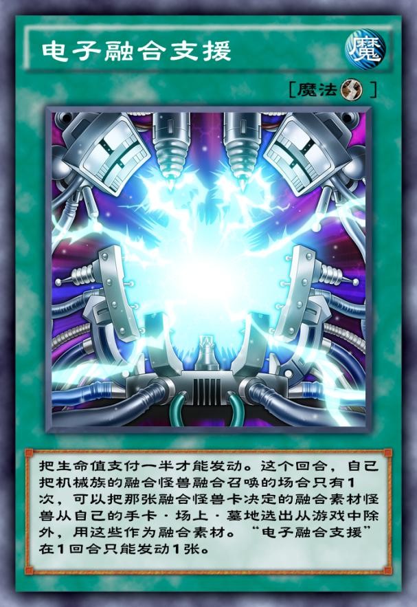先说下电子融合支援这张卡吧,这张卡可以通过支付一半生命值来让这回合机械族怪兽的融合素材从手卡、场上以及墓地从游戏中除外来进行融合,通过这一效果我们可以快速融合出本家大怪,同时电子融合支援发动之后可以直接触发电子流派的效果,为我们提供本家终端的融合素材,这点是非常关键的。
